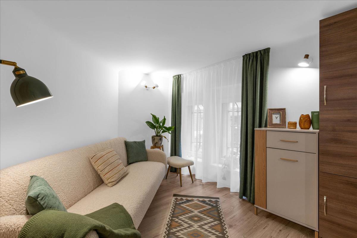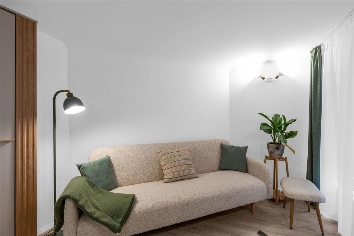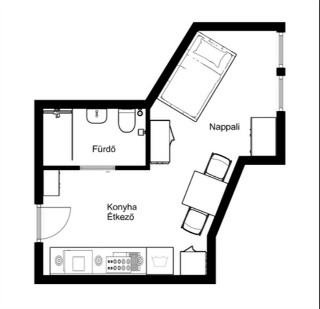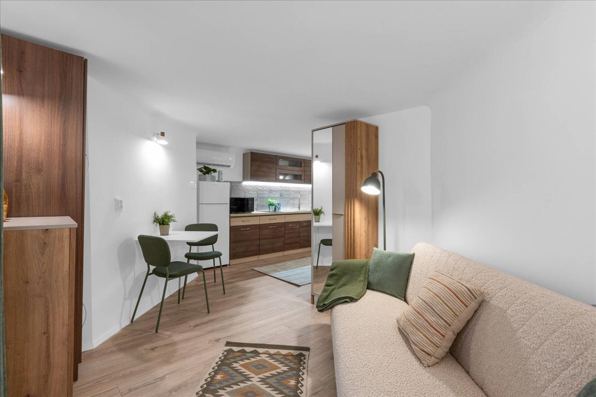 A 21nm -es alapterület ellenére a térérzet kiváló, köszönhetően az átgondolt tervezésnek és a nagy belmagasságnak.