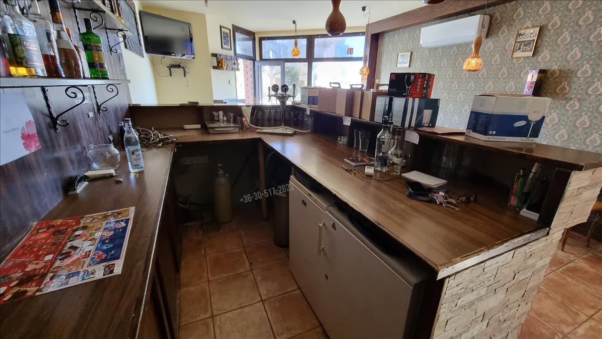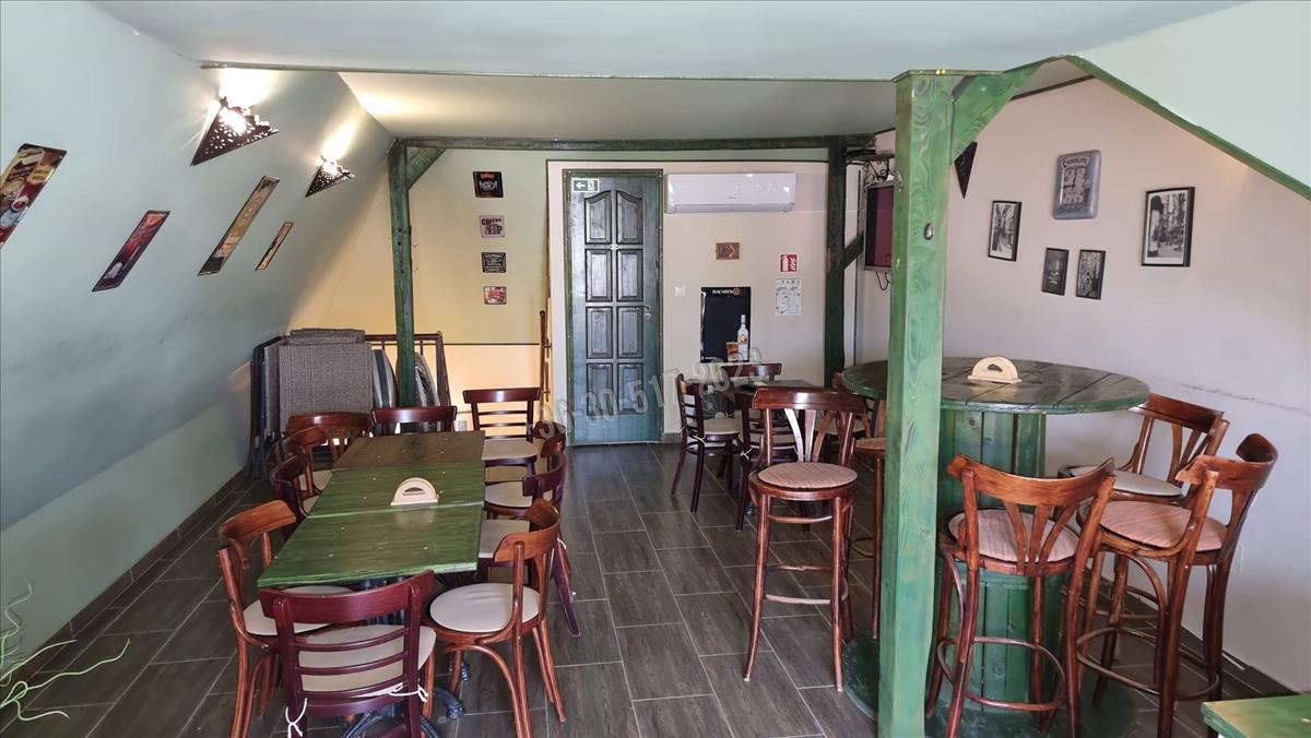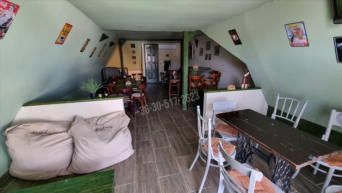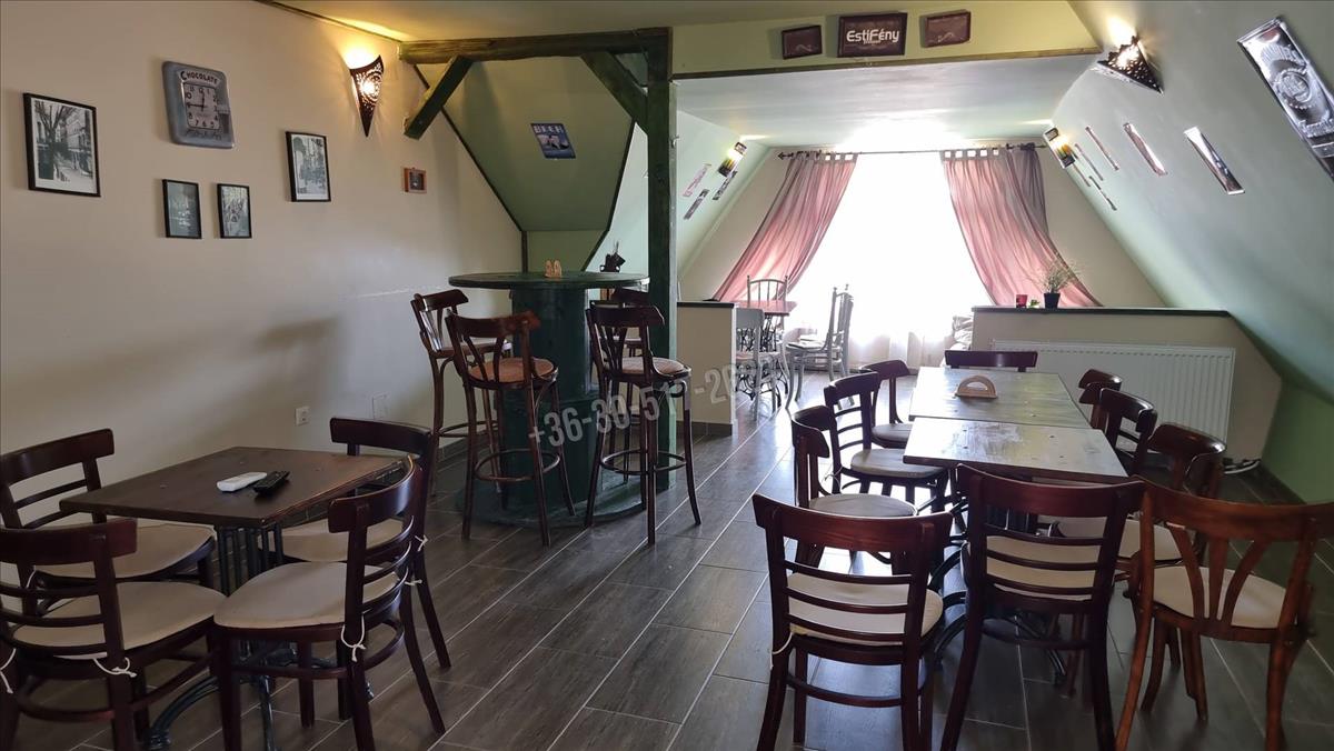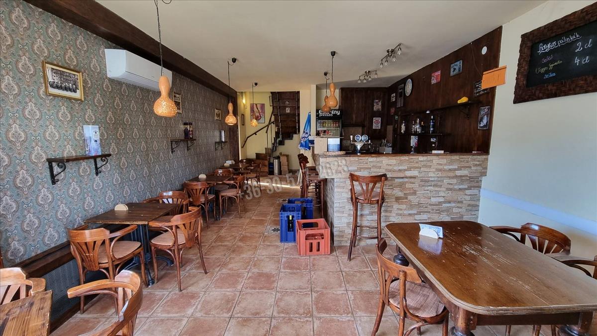 A földszinten egy tágas vendégtér, bár, mosdók és kiszolgáló helyiség található. Az emeleten további vendégtér és kiszolgáló helyiség áll rendelkezésre. a vendéglátó egység két bejárattal rendelkezik, az oldalsó ajtón keresztül elérhető közterület, igény szerint további asztalok elhelyezésére, vagy akár terasz kialakítására is alkalmas. Fűtését kondenzációs gázkazán biztosítja radiátorok segítségével, hűtését szintenként egy új klíma segíti.