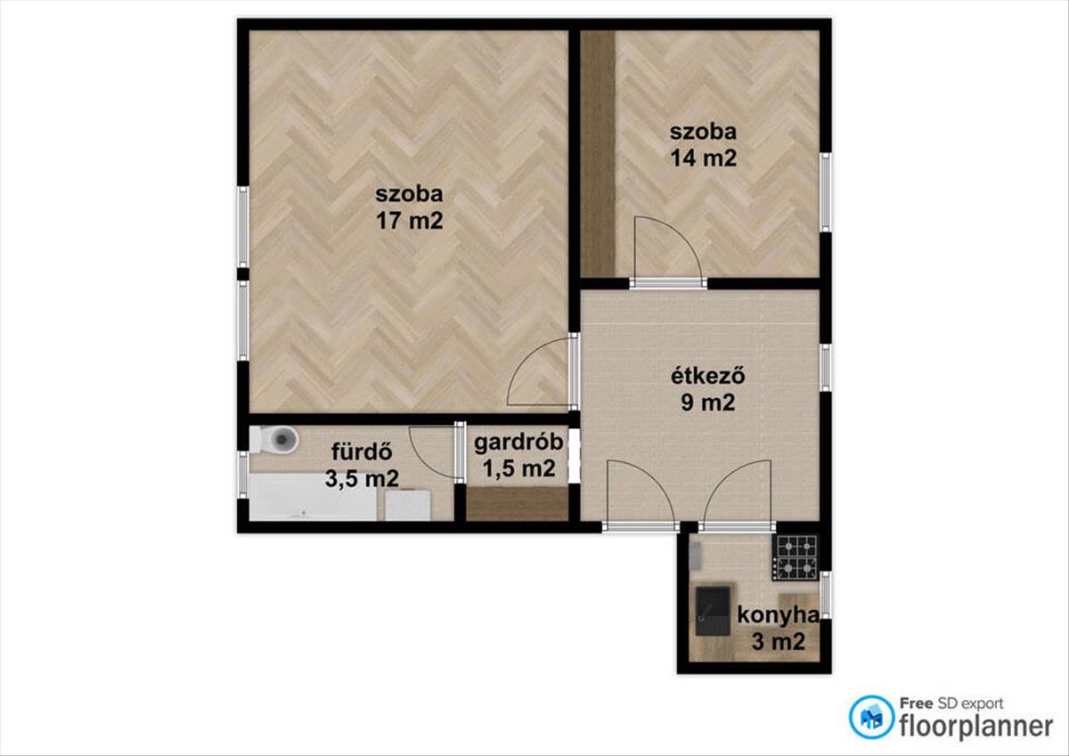 - 48 m2, 2 szoba, étkező, külön konyha, fürdő és wc, gardrób