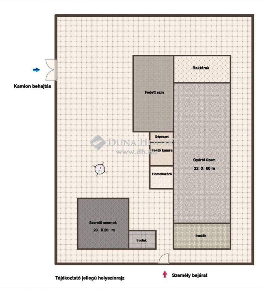 Teljesen térkövezett környezet, a csarnokokban ipari beton burkolat található
