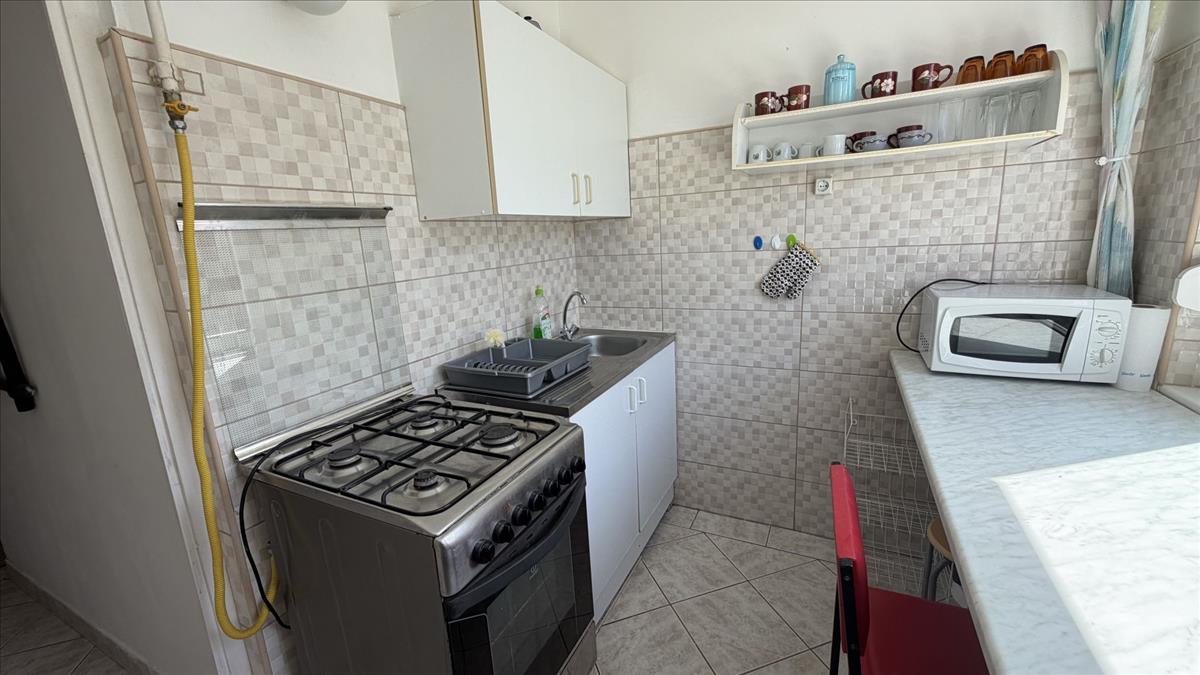 The apartment features 2 separate rooms, is equipped with air conditioning, and comes fully furnished (washing machine, refrigerator, microwave). It has plastic windows and doors and is connected to district heating, making it cost-effective to maintain. Street parking is available.