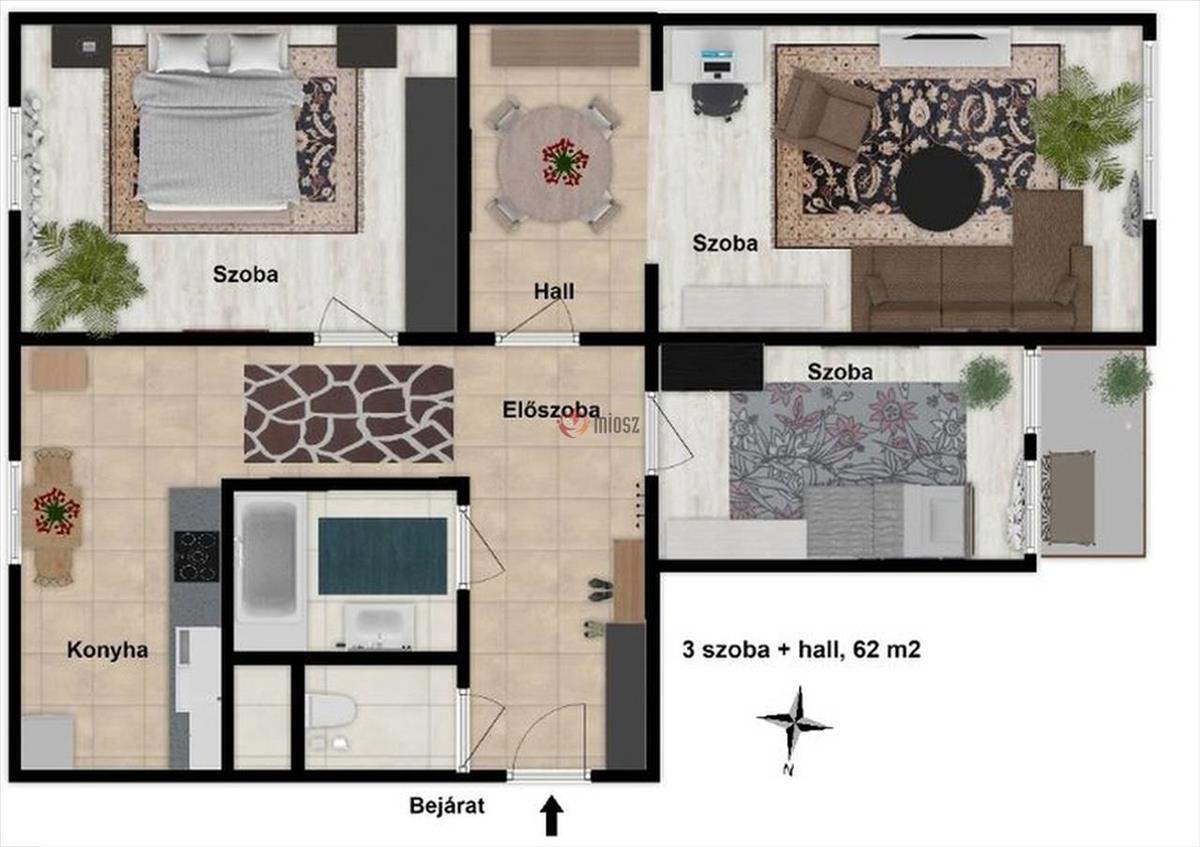 A lakás mérete 62 m2, elrendezése 3 szoba, hall, konyha, fürdő és wc külön helyiségben. a legkisebb szoba erkélyes.