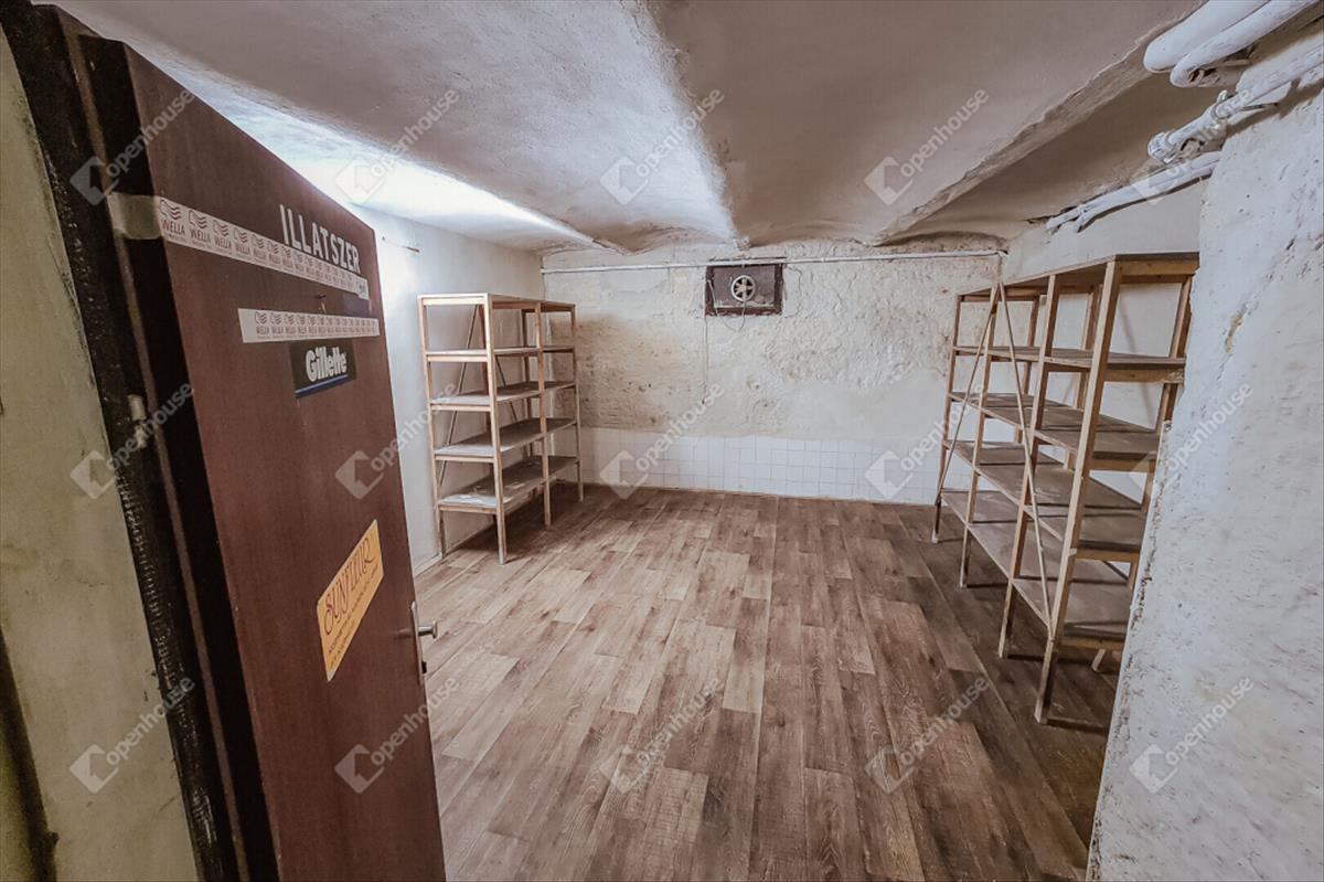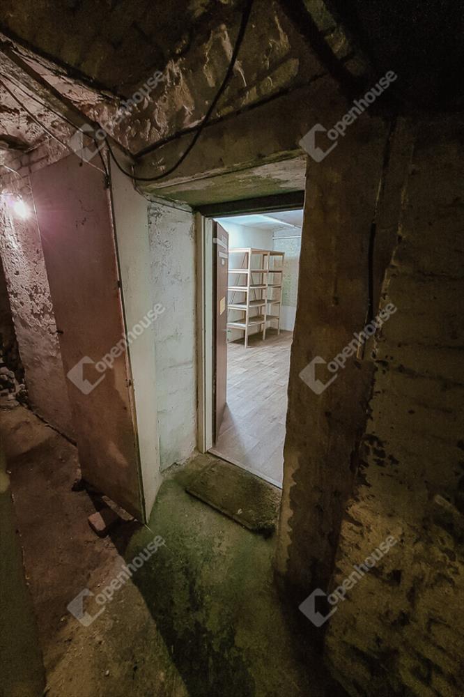 Az alagsori helyiség kivilágított lépcsőházon át közelíthető meg. Jó állapotú, zárható faajtón keresztül lépünk az egy légterű, 2, 25 m belmagasságú, 20 m²-es helyiségbe, mely fa hatású pvc műpadlóval borított. a pince nem vizesedik, levegője száraz, szellőzését elektromos ventilátor segíti. a világításról egy falra szerelt nagy fényerejű UFO-lámpa gondoskodik. Két nagyméretű pozdorja polc található a helyiségben, melyek igény szerint használhatók.