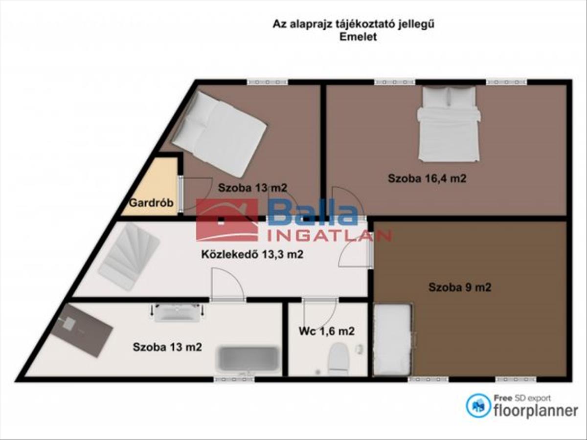 A felső szinten három külön nyíló szoba található, amelyek közül az egyikhez külön gardróbrész is tartozik.