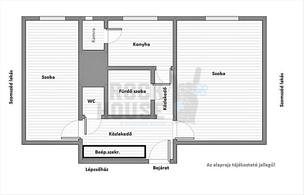 A lakás helyiségei: két szoba, konyha, kamra, közlekedő, fürdőszoba, külön wc. a lakáshoz földszinti tároló helyiség is tartozik. a lakásban fa bejárati ajtó, és új nyílászárók lettek beépítve, redőnnyel és szúnyoghálóval szerelve.