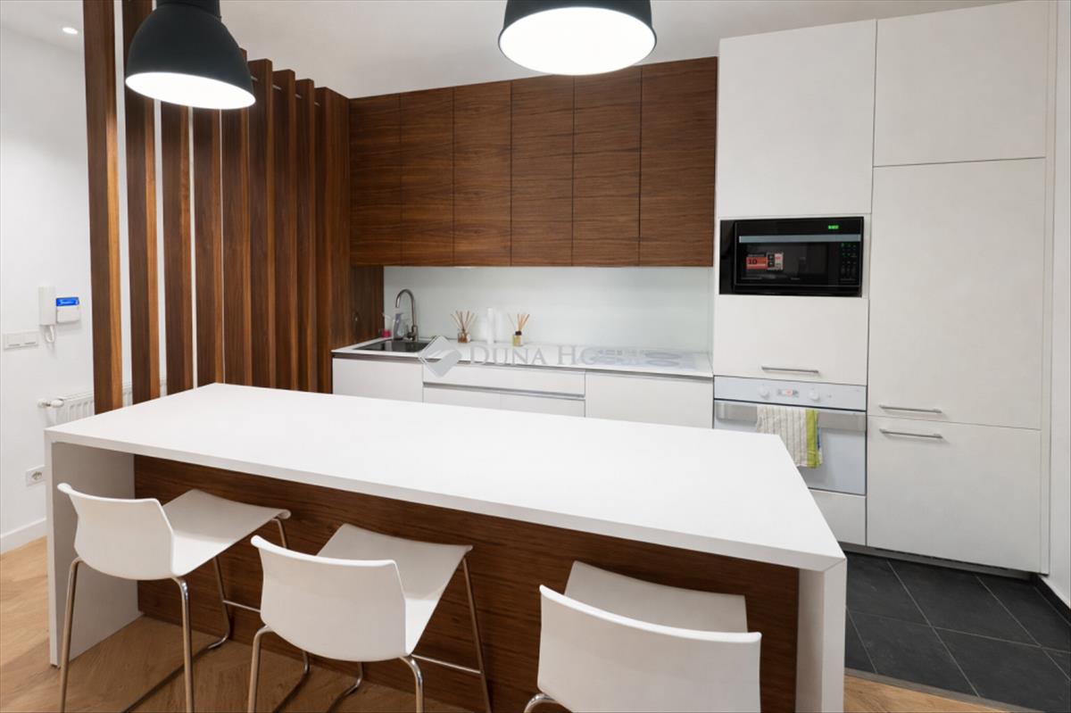 Főbb jellemzők:2 hálószoba + tágas nappali erkély3 fürdőszoba külön háztartási helyiség teljesen gépesített konyha (főzőlap, elszívó, mikró, mosogatógép, hűtő) mosó-szárítógép egyben gázcirkó fűtés + hűtő-fűtő klímaokos termosztát telefonról vezérelhető fűtés és klíma led hangulatvilágítás az egész lakásban.