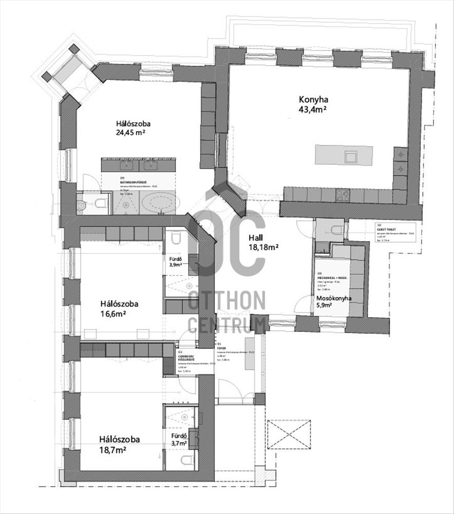 Két fürdőszoba és egy külön vendég mosdó biztosítja a mindennapi komfortot, míg a fő hálóhoz kapcsolódó fürdő a privát használat szintjét emeli.