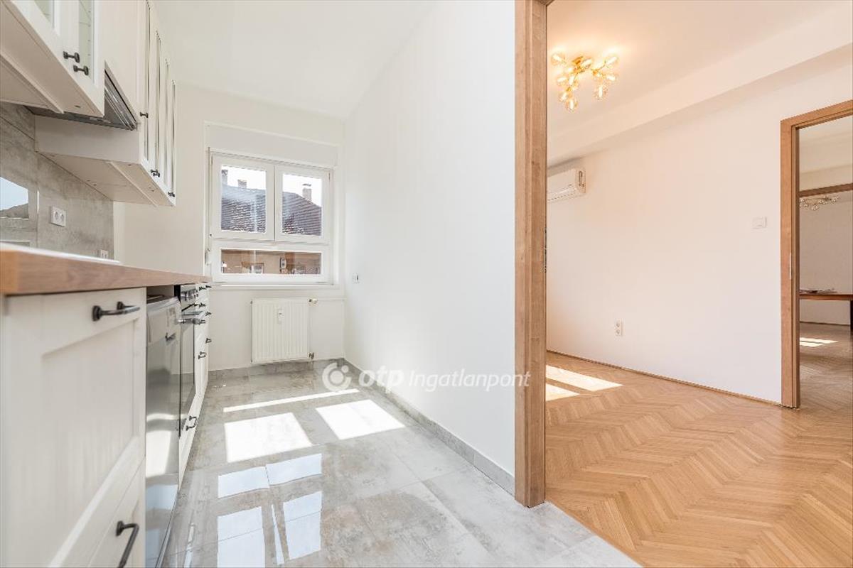 Az ingatlan újszerű állapotban van, annak teljeskörű felújítása mindenre kiterjedt, megtörtént a villanyvezetékek cseréje, a vizes blokkok és a konyha teljes átépítése, a belső fa nyílászárók cseréje, burkolatok modernizálása és a festés. Konyhája újszerű és gépesített, hűtőgéppel, mosogatógéppel, főzőlappal, sütővel és elszívóval rendelkezik.