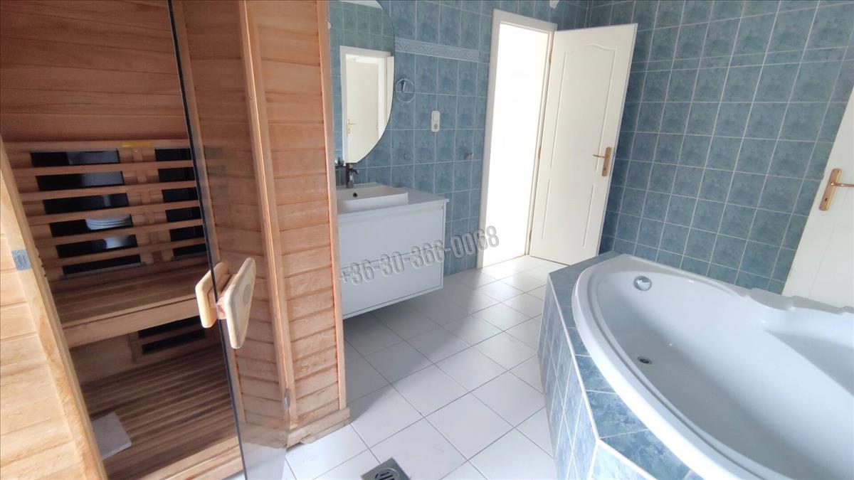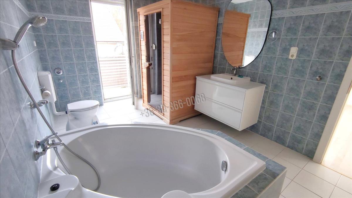 A tágas, ablakos fürdőszobában sarokkád, mosdó, wc és szauna található.