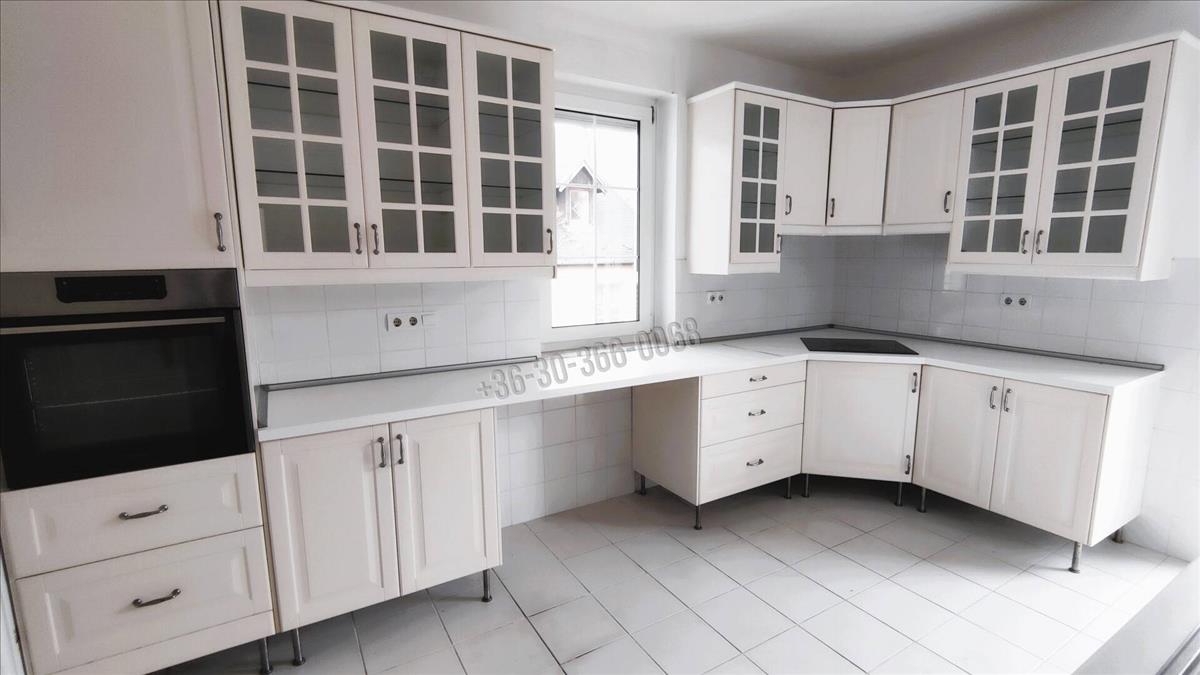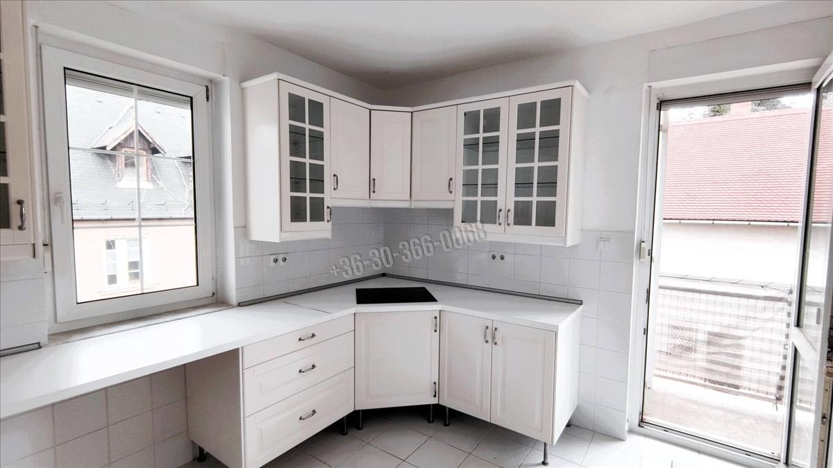 Az erkélyes, világos konyhában beépített bútorok, elektromos főzőlap, sütő, mosogatógép, hűtő és mikró rendelkezésre áll.