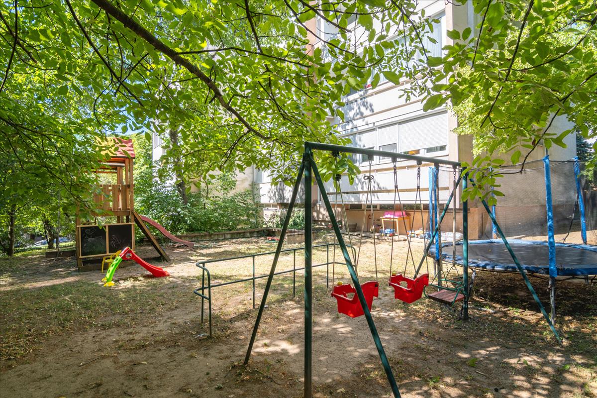A társasház különlegessége a hatalmas, gondozott parkositott közös kert, kicsiknek játszótérrel.