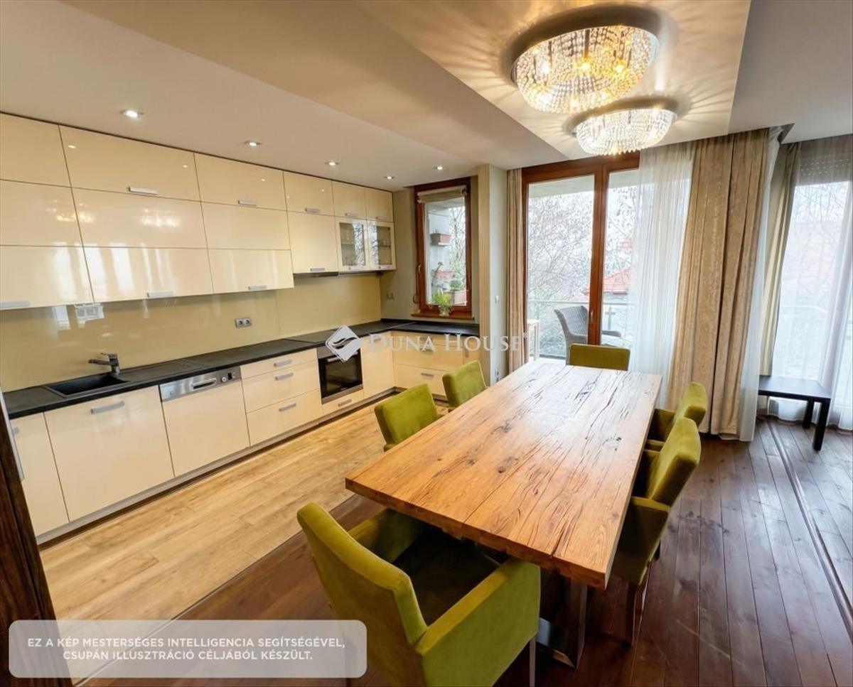 Located in one of the most sought-after green residential areas of Budapests 2nd district, in Szemlőhegy on Szeréna Street, this 113 sqm elegantly furnished apartment is available for rent. The property is situated on the 2nd floor of a modern building constructed in 2011, equipped with an elevator. The apartment features a balcony with panoramic views of Pest, as well as a second balcony overlooking the garden. The layout is ideal: a spacious living room with dining area, 2 bedrooms plus a separate study room, making it a perfect choice for home office use. The property is fully furnished and offers a modern, fully equipped kitchen (built-in dishwasher, oven, hob, and combined fridge-freezer). a washing machine is located in a separate utility room. The living room and bedrooms are air-conditioned. The apartment also includes:1 parking space in a secure underground garageDirect elevator access from the garage to the residential levelThe neighborhood is quiet and green, yet the city center is easily and quickly accessible. An excellent choice for families, with several playgrounds and green areas nearby. Pets are welcome.