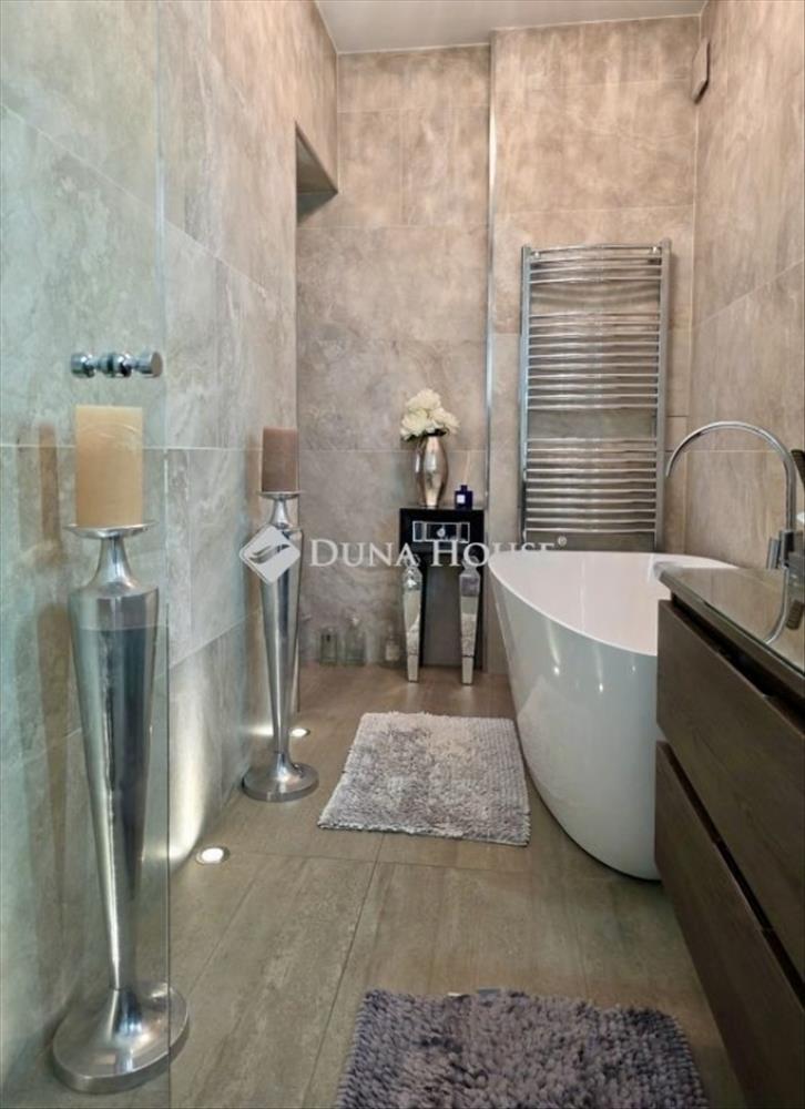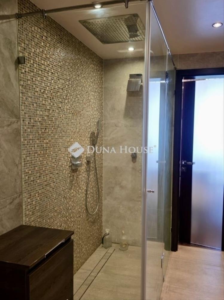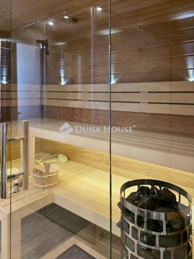 A hálószobából nyílik a szabadon álló kádas fürdőszoba, ahonnan továbbhaladva egy különleges, szaunával és hatalmas zuhannyal ellátott térbe jutunk egy valódi wellness-részleg a saját otthonodban.