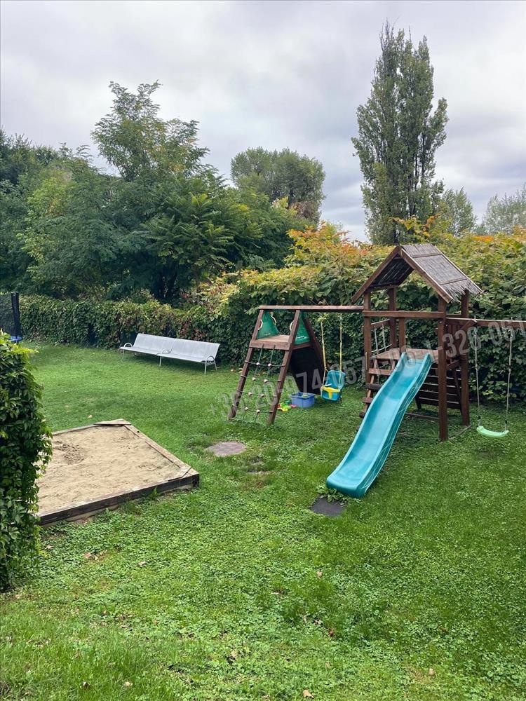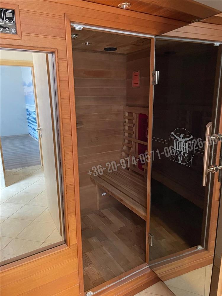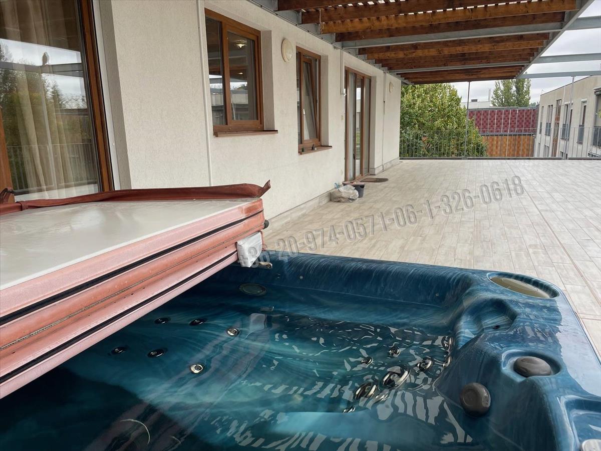 Tágas, világos, déli fekvésű amerikai konyhás nappali étkezővel, 3 hálószoba, az egyik külön emeleten. Az alsó és a felső szinten is van fürdőszoba. Az emeleten infraszauna és a teraszon nagy méretű 4 személyes jakuzzi is helyet kapott. Minden szobában klíma. Részben berendezett és gépesített.