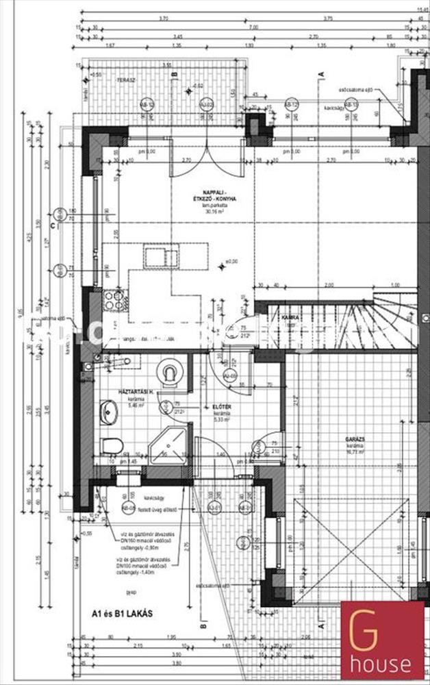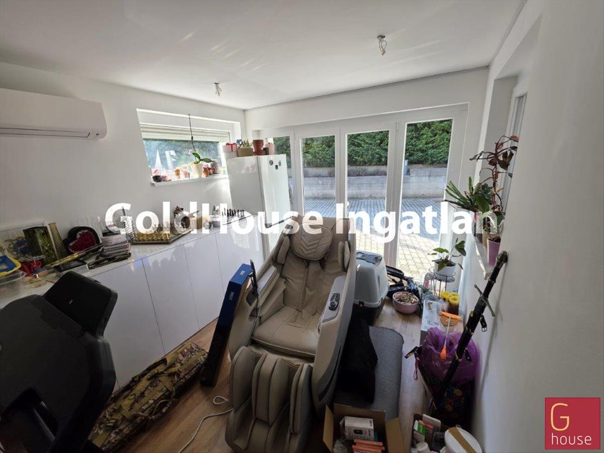Az alsó szinten egy világos, amerikai konyhás nappali-étkező kapott helyet, amely közvetlen kapcsolatban áll a terasszal és a gondozott kerttel, így tökéletes teret biztosít a mindennapi élethez és a kikapcsolódáshoz egyaránt. Ezen a szinten található egy külön hálószoba is, amely a korábbi garázs helyén került kialakításra, továbbá egy zuhanyzós fürdőszoba WC-vel.