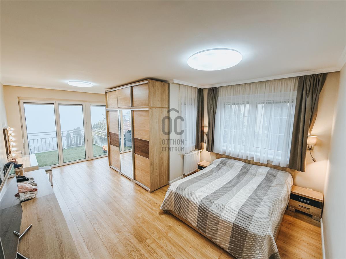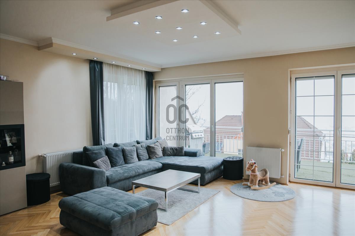 Az előszoba - nappali - étkező -konyha egy légteret képezve 55 m2-es területen adja meg a tágas életteret a gyönyörű panorámával és teraszkapcsolattal. a hatalmas teraszt műfűvel fedtük, így még inkább kert hangulatát kelti, nyári baráti összejövetelek, sütögetések ideális helyszíne. Az előszobából külön wc nyílik. a folyosóról közelíthető meg a 3 tágas háló, melyek 22, 20 és 13 m2-esek. a középső méretű hálóból a hátsó kis teraszra jutunk. Egy dupla mosdós nagy sarokkádas fürdőszobán kívül külön zuhanyzó is rendelkezésre áll, itt található a kondenzációs kazán és a mosógép is. a lakás klimatizált, a fűtés okostelefonról is vezérelhető, a terasz elektromos napellenzővel árnyékolt. Az ingatlant pár éve teljesen felújítottuk, riasztó és biztonsági ajtó védi a benne lakókat.