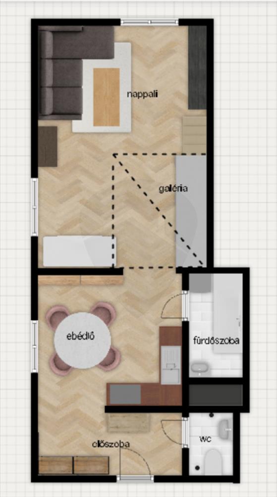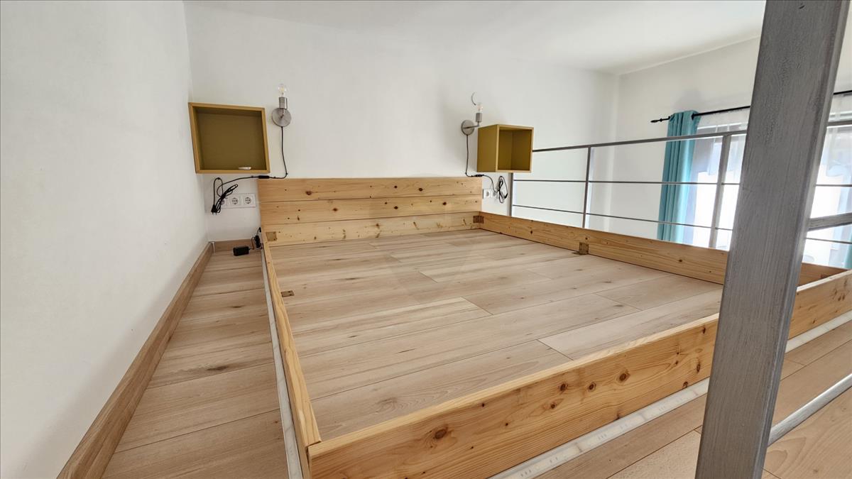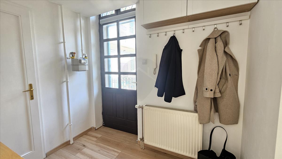 A lakás elrendezése praktikus, minden hely ki van használva, rengeteg tárolóval és szekrénnyel ellátott. Külön előszobát alakítottak ki, ami ritka az egyszobás lakásoknál. a félig álló galéria alatt beépített szekrény van, a francia ágykeretbe igény szerint matrac is kérhető. a fürdőszobában kád van és egy teljesen új mosógép, a wc külön helyiségben kapott helyet. a lakás teljesen felszerelt, pároknak, egyetemistáknak tökéletes.