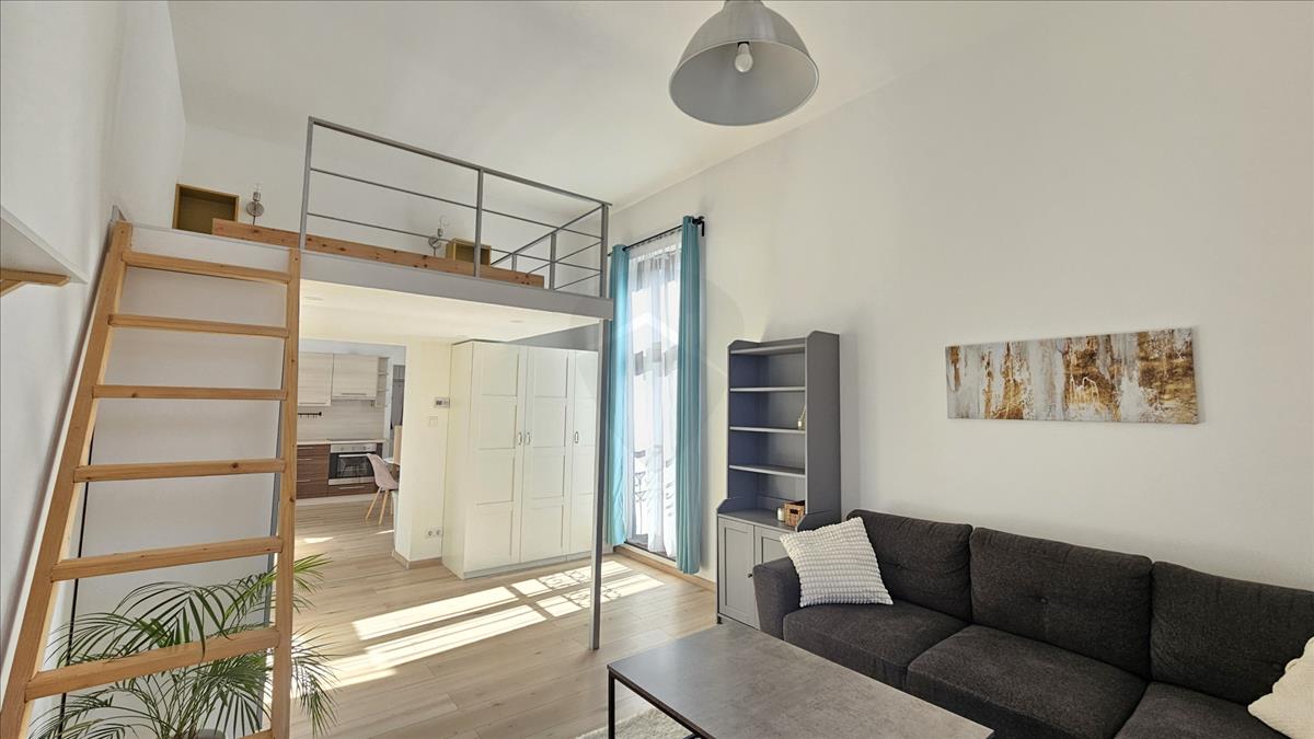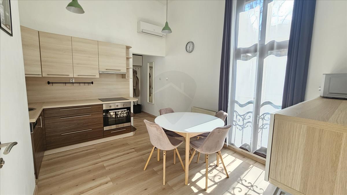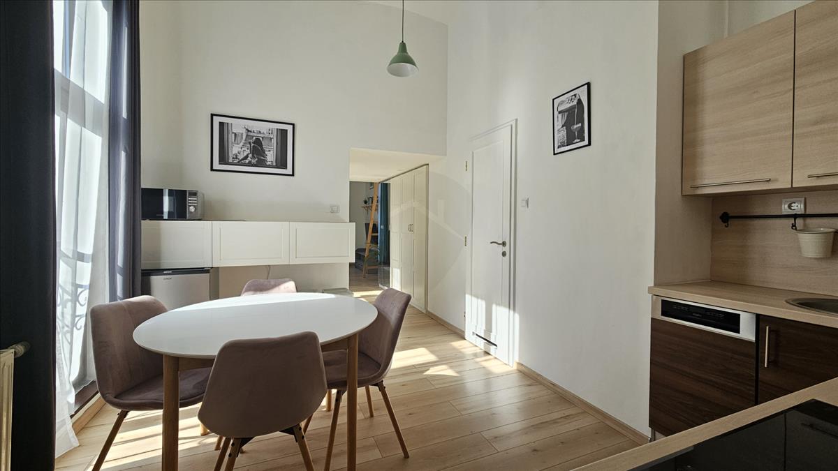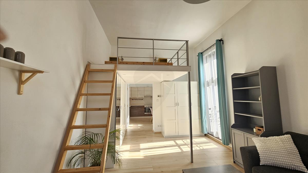 Kiadó a IX. kerület kedvelt, biztonságos és csendes részén a liliom utcában egy nagyon világos földig érő ablakokkal rendelkező újszerű egy szobás galériás lakás.