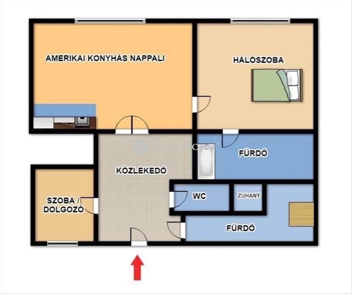 A lakás elosztása ideális: kényelmes nappali és konyha egy térben, világos és tágas hálószoba fürdőszoba kapcsolattal, kis szoba ideális egy személynek vagy dolgozó/ vendégszobának.