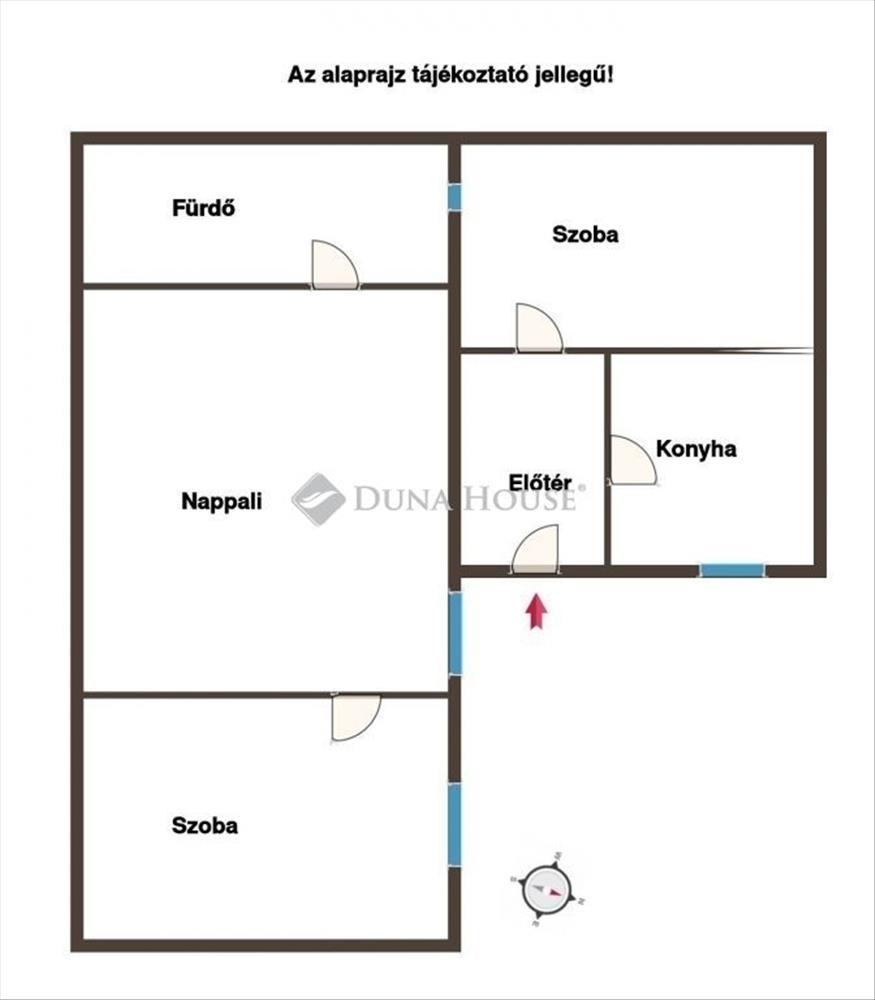 Az ingatlanba lépve egy közlekedőbe érkezünk, amely biztosítja a helyiségek közötti kapcsolatot.