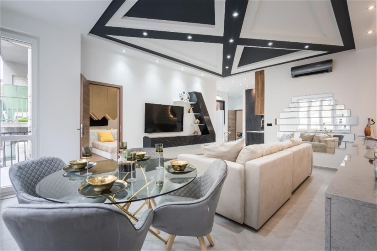 Klímaberendezés segít a forró napokon a lakás hűtésében. Színvonalas, igényes élettér, minőségi bútorokkal, TV-vel.