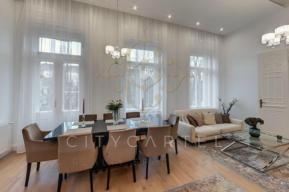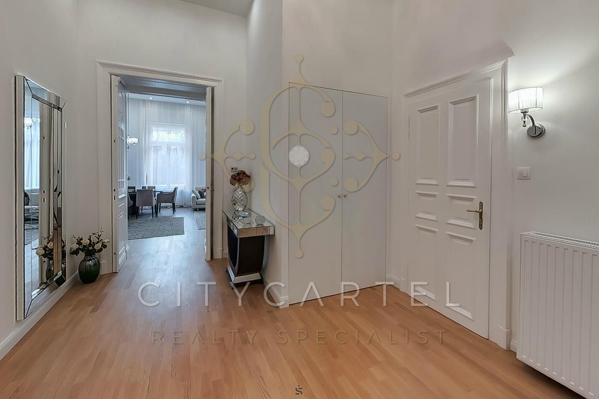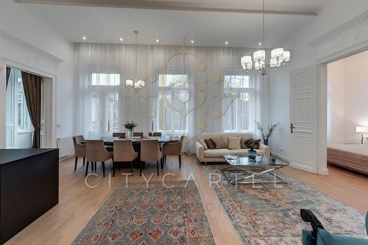A lakás 134 nm-es, tágas, 2018-ban luxus módon felújított, elegáns, nagy belmagasságú, igényesen berendezett.
