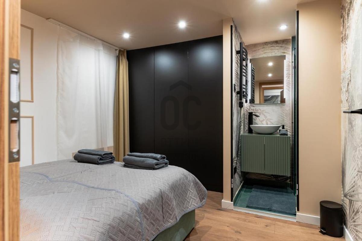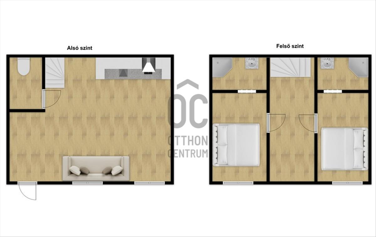 A felső szinten két külön hálószoba került kialakításra, mindkettő saját fürdőszobával, ami ritka és rendkívül kényelmes megoldás akár lakótársak számára is. a hálószobák szintén bútorozottak.