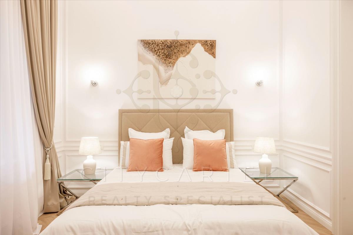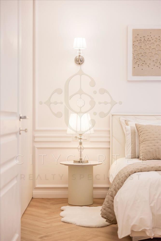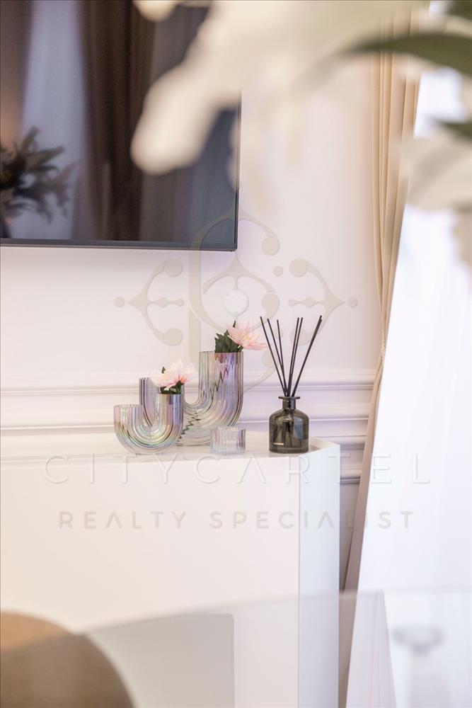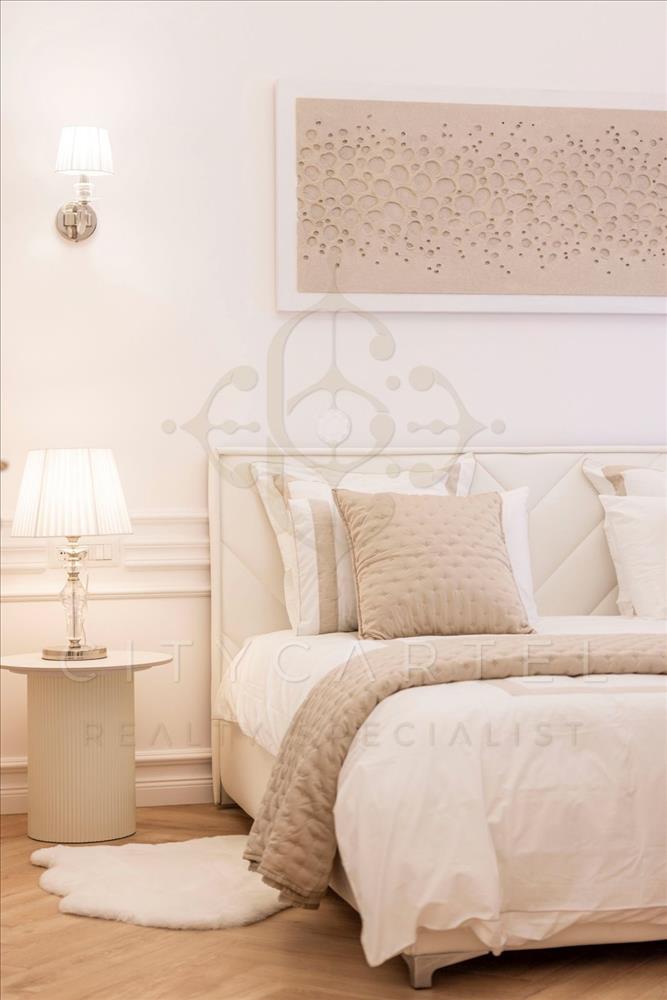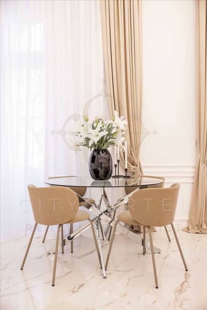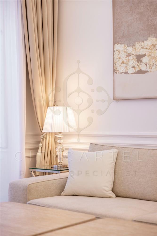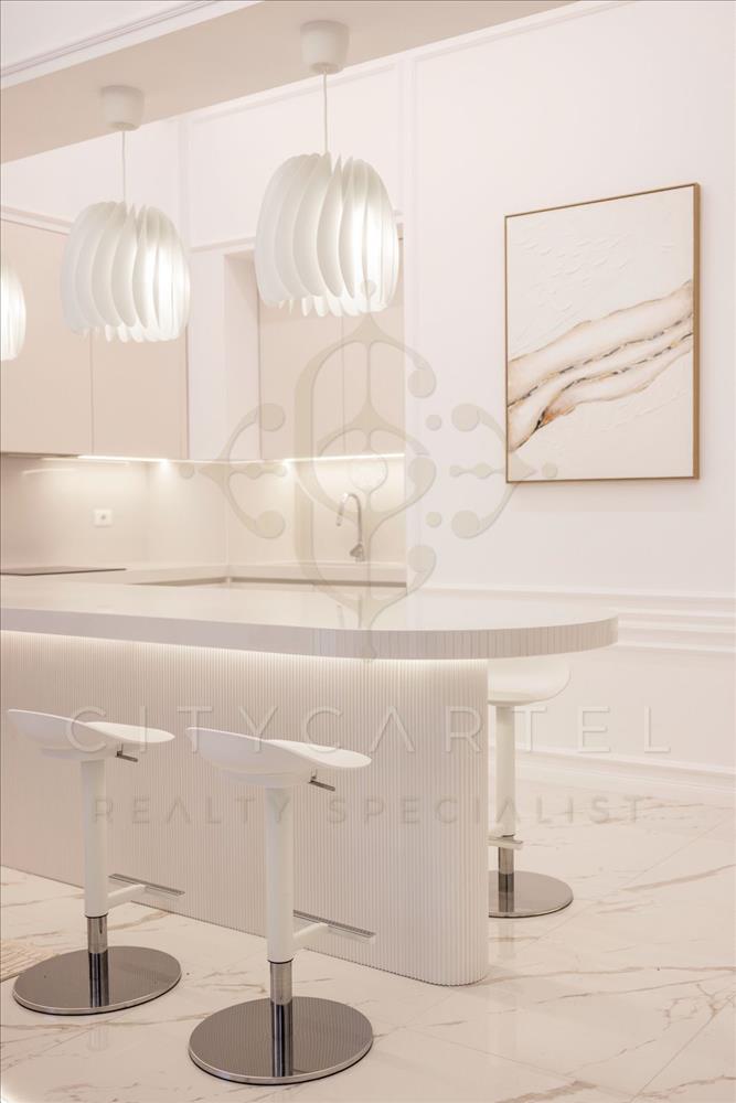 A nagy, utcára néző ablakokon áradó természetes fény még inkább kiemeli a terek tágasságát és az eleganciát. a lakás minden eleme a funkcionalitás és a kifinomultság tökéletes harmóniáját képviseli.