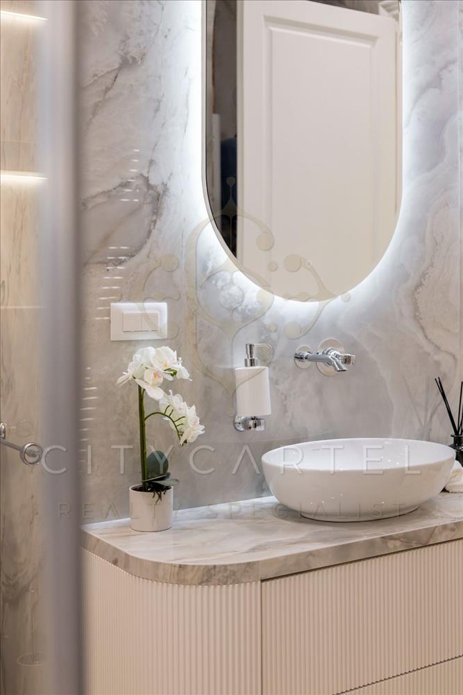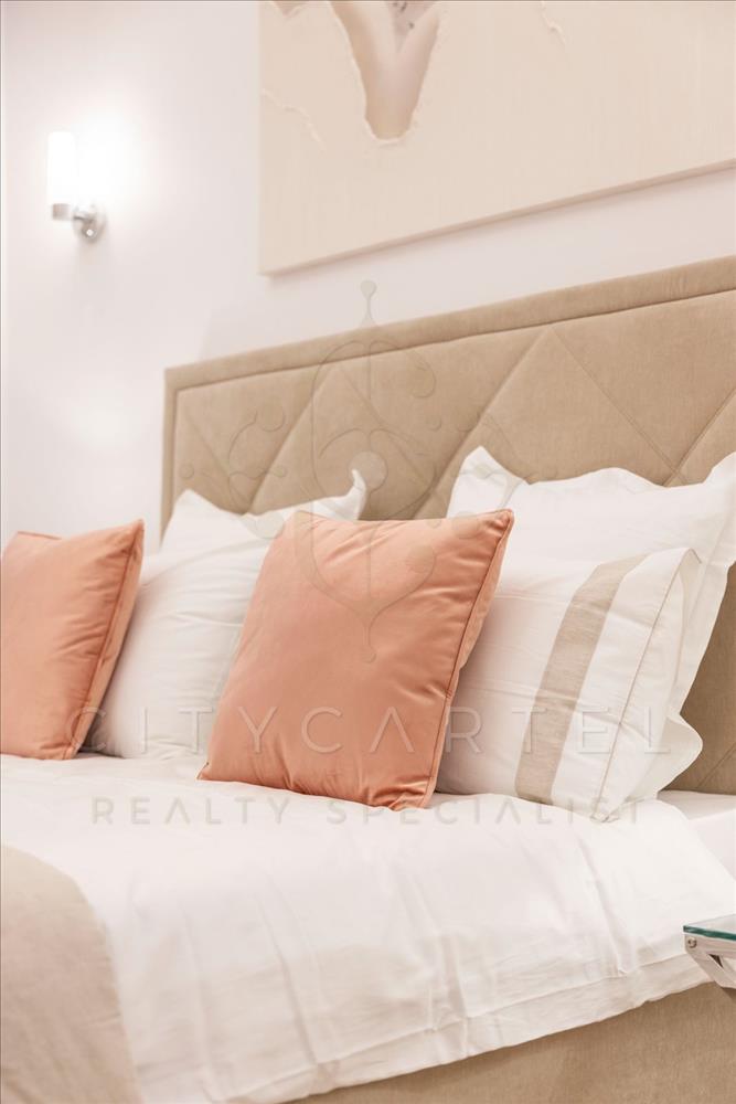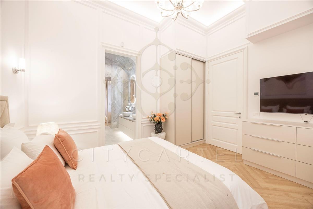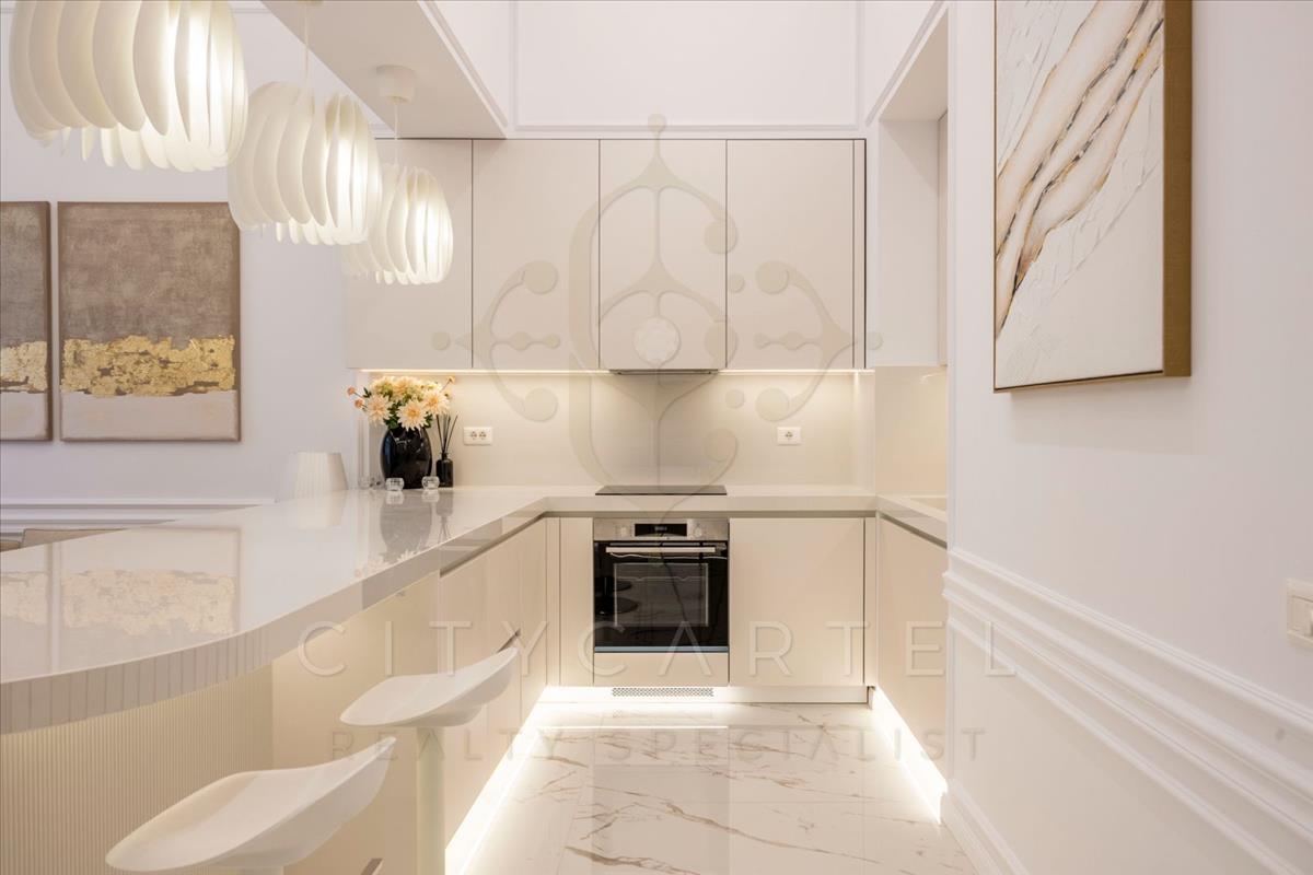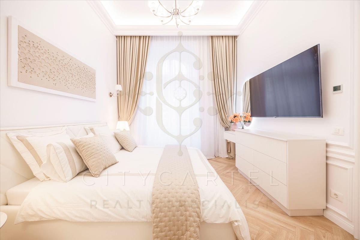A nagy, utcára néző ablakokon áradó természetes fény még inkább kiemeli a terek tágasságát és az eleganciát. a lakás minden eleme a funkcionalitás és a kifinomultság tökéletes harmóniáját képviseli.