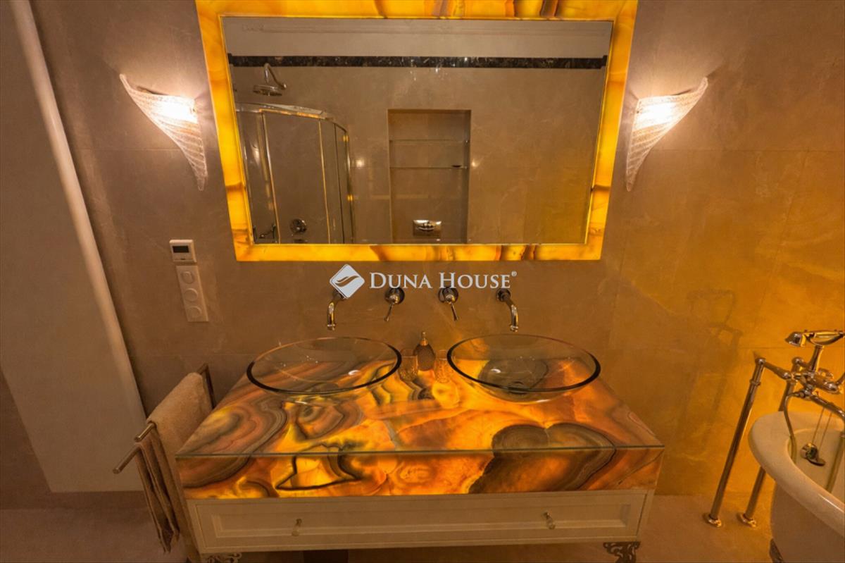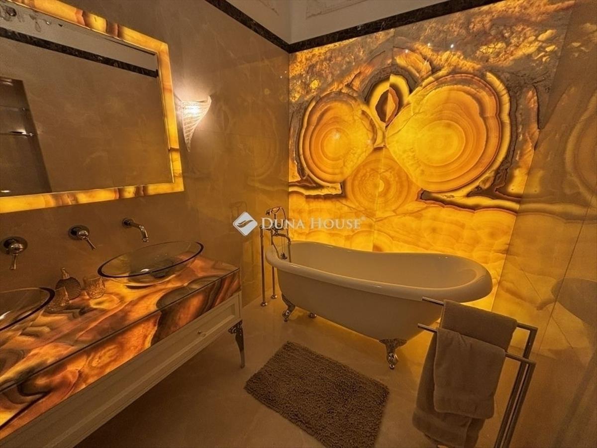 Az ingatlan három különálló hálószobával rendelkezik, amelyek kényelmes privát teret kínálnak. a két fürdőszoba elegáns megjelenését szintén különleges anyaghasználat emeli ki, köztük a háttérvilágított onyx kő felület, amely luxus hangulatot ad a térnek.