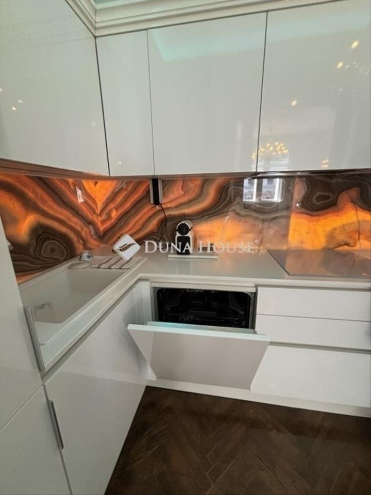 A modern, egyedi tervezésű konyhai tér harmonikusan kapcsolódik a nappalihoz, így egyszerre praktikus és látványos. a magasfényű fehér bútorzat letisztult megjelenést biztosít, amelyet hangulatos világítás egészít ki. Az enteriőr egyik legkülönlegesebb eleme a háttérvilágított onyx kő burkolat, amely meleg fényével igazán exkluzív hangulatot teremt. a prémium minőségű beépített gépek sütő, mikrohullámú sütő, mosogatógép, főzőlap és mosógép a modern élet minden kényelmét biztosítják.