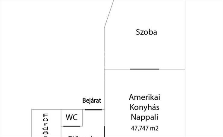 A lakás a második emeleten helyezkedik el, amerikai konyhás nappaliból, hálószobából, előszobából, fürdőszobából és még egy különálló WC-ből áll.