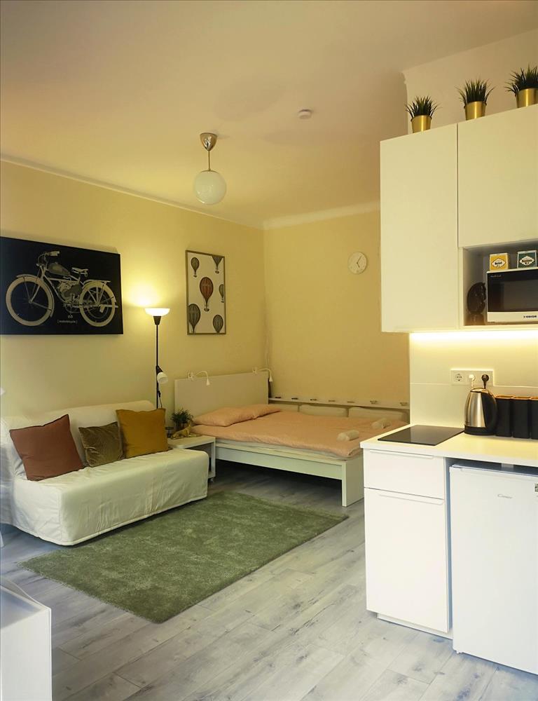 The 26 m² apartment has an ideal layout (spacious 23 sqm living–dining area plus a 3 sqm bathroom with window). It is exceptionally bright, has a pleasant atmosphere, and is furnished and equipped to a high standard.