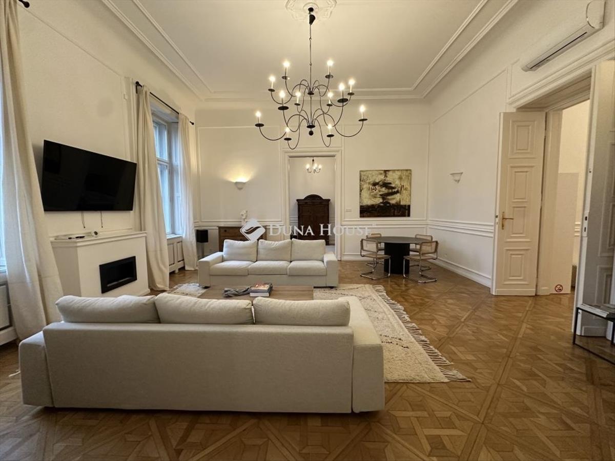 Kiadó az Andrássy út egyik patinás, nagypolgári épületének 2. emeletén egy igényesen felújított, 128 négyzetméteres, nappali + két hálószobás lakás.