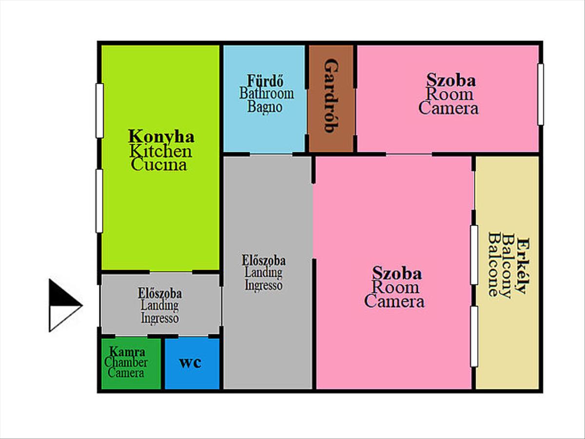 Konyhája étkezős méretű, fürdője kádas, a hálószobák különnyílóak.