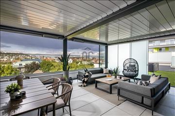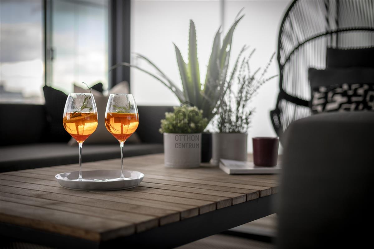 A terasz külön világa a lakásnak: hangulata és miliője kivételes, nyugati tájolása miatt egész nap kellemes fényt kap, miközben városi panoráma nyílik.