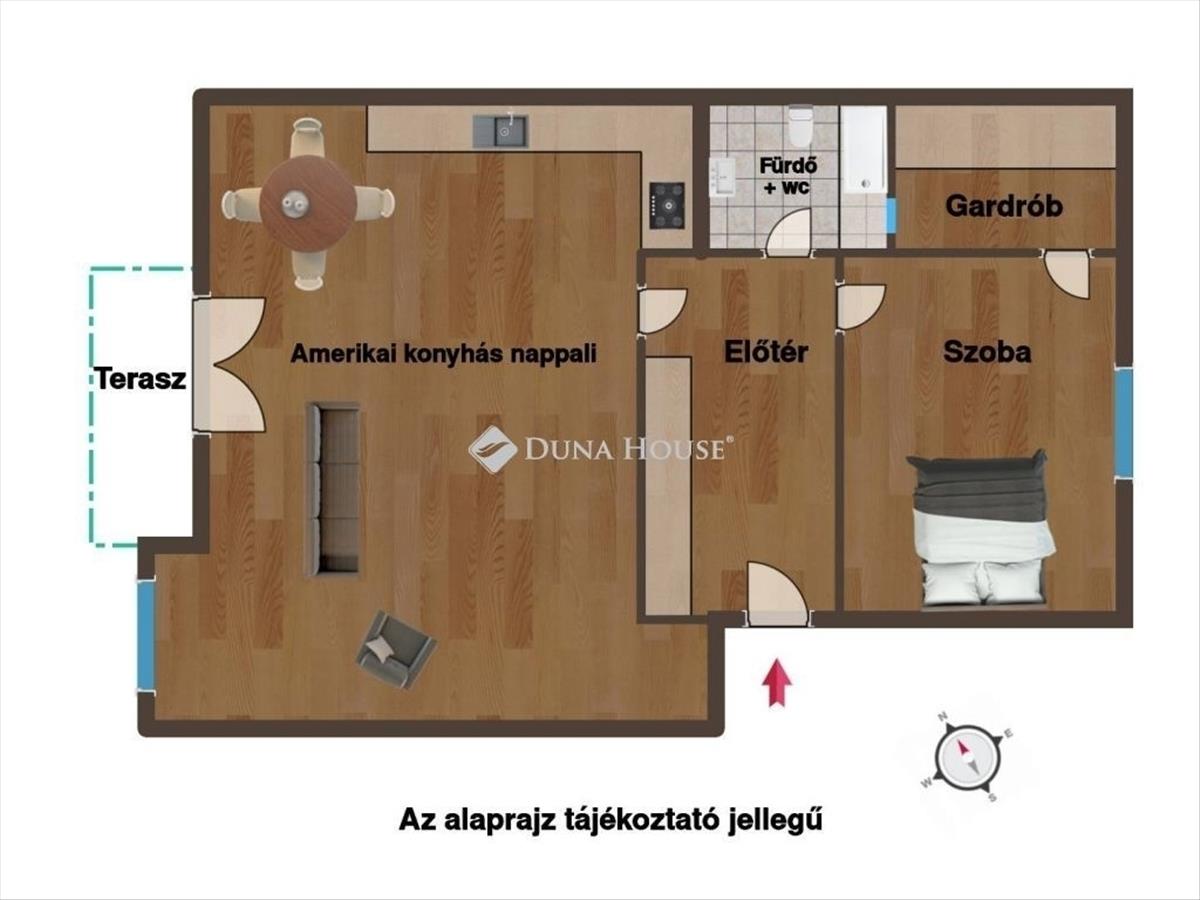 Elosztás: előszoba, amerikai konyhás nappali, hálószoba + gardrób, zuhanyzós fürdő, terasz