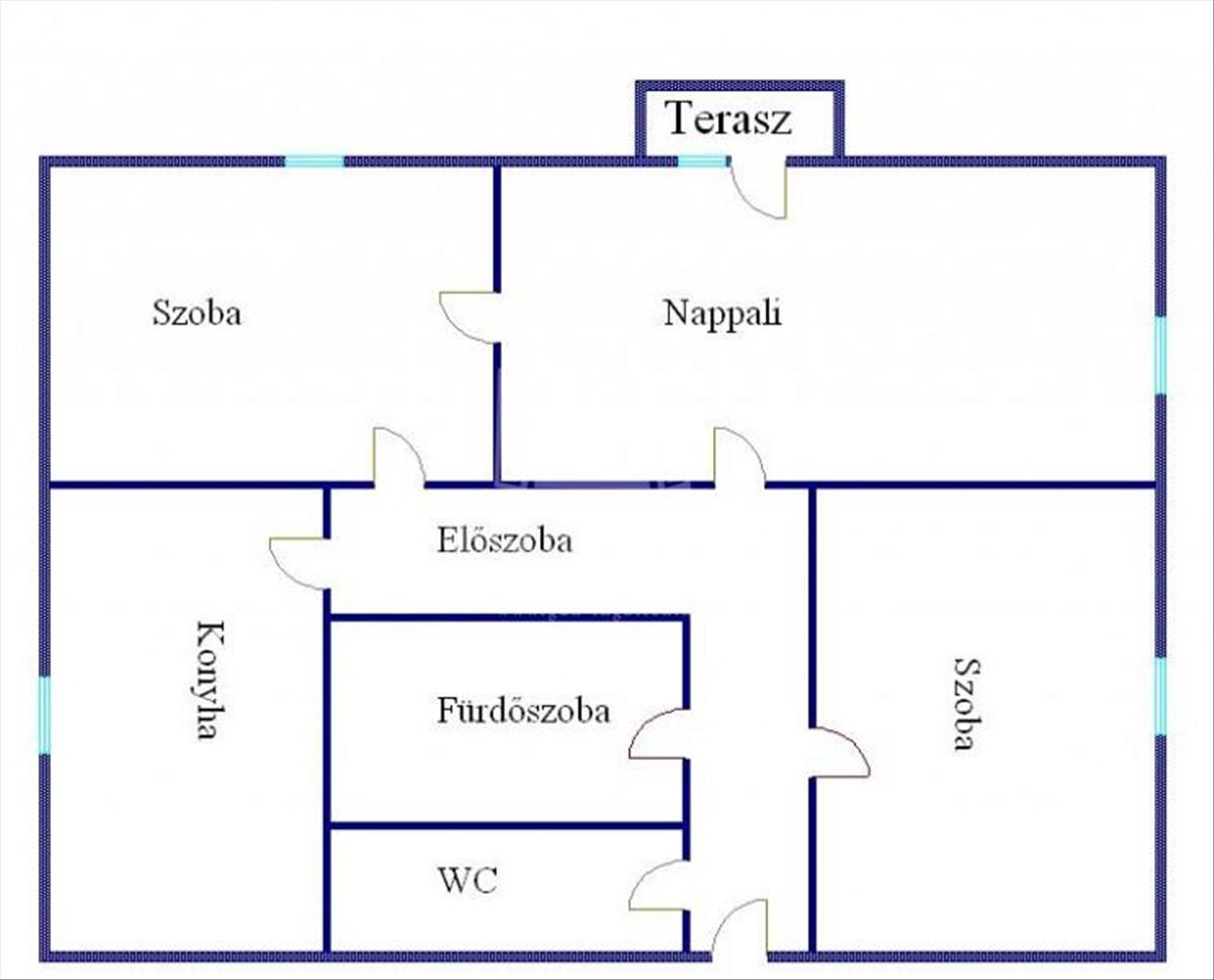 Helyiségei: előszoba, konyha+étkező, wc, fürdőszoba+WC, nappali+2 szoba, erkély(3m2).