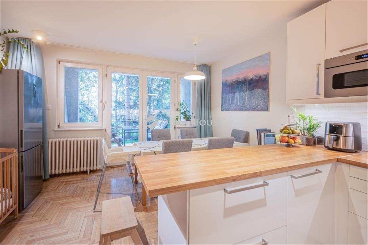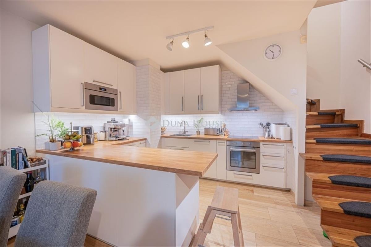 Az alsó szinten egy modern, nagy, gépesített konyha és étkező kapott helyet, amely közvetlen kapcsolatot biztosít a teraszhoz és a saját, gondozott kertrészhez, amely egy átmenő forgalomtól mentes, csendes zsákutcára néz. a konyha és a terasz is teljeskörű felújításon esett át: beépített mikróval, pirolitikus sütővel és indukciós főzőlappal felszerelt. a terasz tökéletes helyszín a közös étkezésekhez, baráti vagy családi összejövetelekhez.