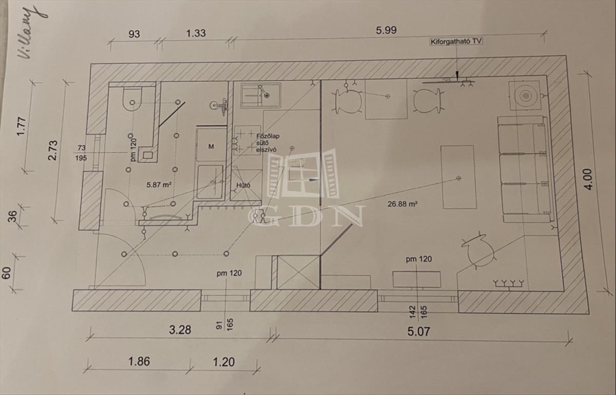 A lakás 33 nm -es, ami egy szobából, előszobából, konyha+étkezőből,