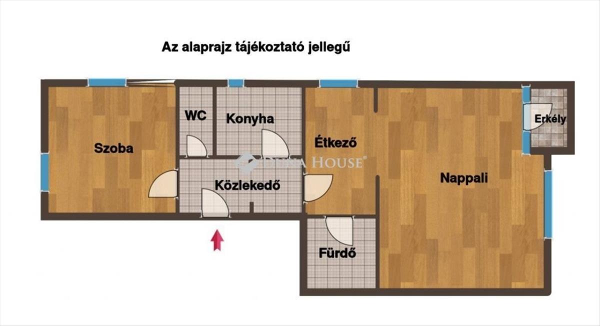 A lakás átgondolt elrendezésű: tágas nappali, kényelmes étkező, külön konyha, hálószoba, két wc (egy külön, egy a fürdőben), valamint egy kis erkély, amely a nappaliból nyílik.