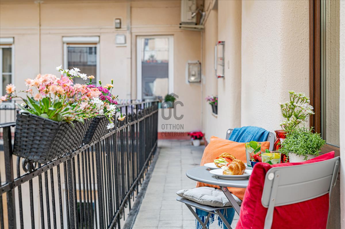 A lakásnak nincs erkélye, viszont a folyosón nem jár el a lakás előtt senki, így bátran ki lehet ülni a gangra a kerti asztalkához egy finom kávéra.
