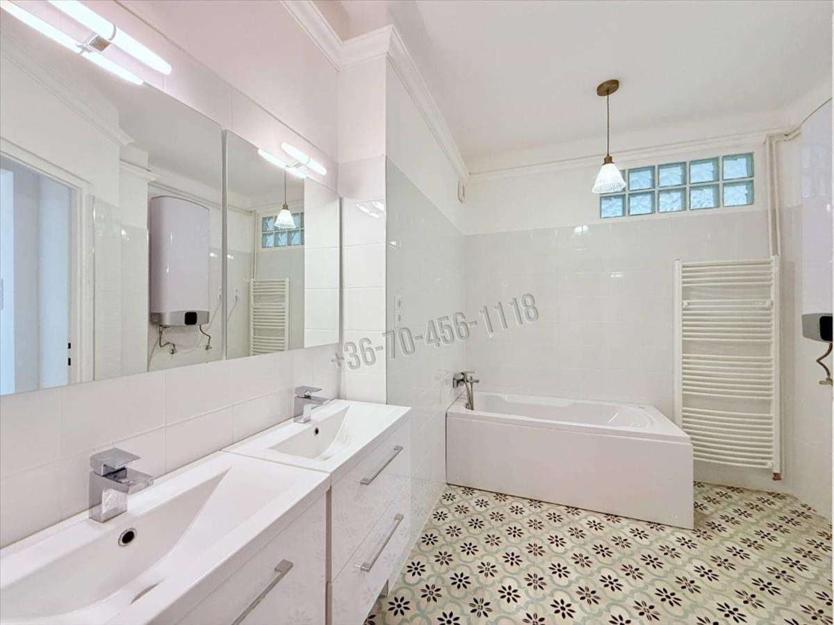 A fürdőszoba kádas kialakítású, törülköző szárítós radiátorral, fiókos szekrényekkel épített mosdókkal felszerelt, ahol a lakás meleg víz ellátását biztosító, új villanybojler is helyet kapott.