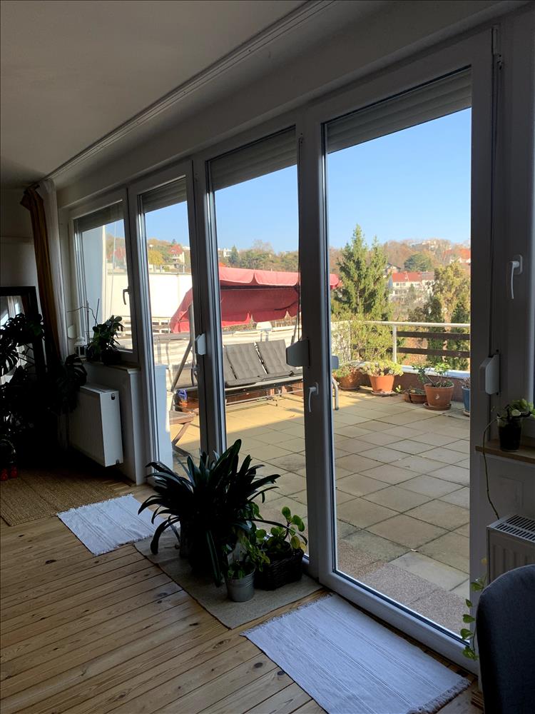 Kiadó a XII. kerület egyik legkedveltebb, csendes és zöldövezeti utcájában egy 78 m²-es, napfényes és tágas lakás, amelyhez egy különlegesen nagy, 30 m²-es, város feletti panorámát biztosító terasz tartozik. a nappali nagy üvegfelületeinek köszönhetően a lakás egész nap világos és levegős. Az elrendezése praktikus: tágas nappali–étkező–konyha, panorámás dolgozószoba, két külön nyíló hálószoba, fürdőszoba, előtér és több tárolóhelyiség alkotja. a lakás külső lépcsőn közelíthető meg, a 3. emeleten van, lift nincs. a parkolás az utcán ingyenes, emellett garázs igény esetén külön díjért bérelhető. a környék csendes, biztonságos és természetközeli, mégis rövid időn belül elérhetők a főbb közlekedési útvonalak és a belváros. a bérleti díj 400. 000 Ft vagy 1. 000 Euró / hó + rezsi, amely átlagosan körülbelül 60. 000 Ft havonta. a lakás azonnal költözhető bútorozottan, vagy részben bútorozva.