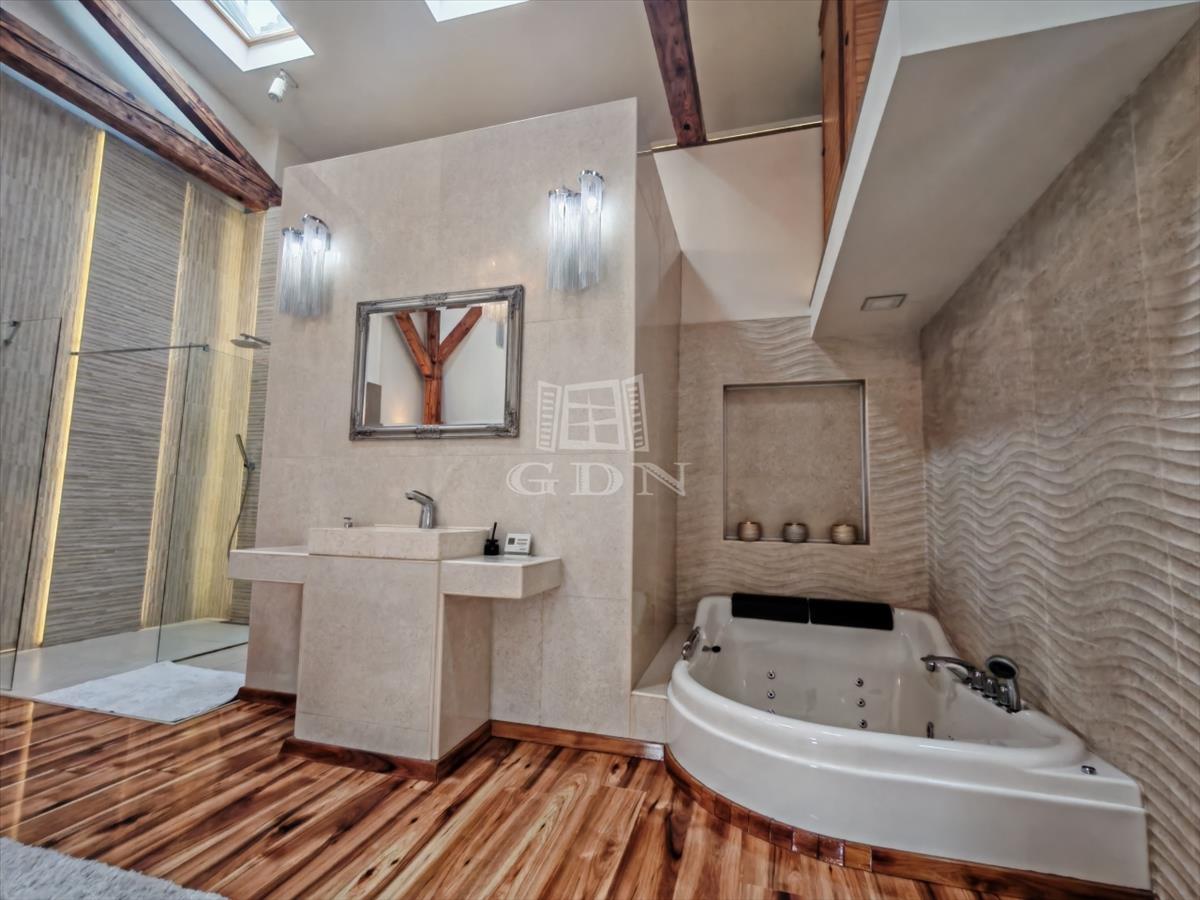Egy exkluzív kétszemélyes pezsgőfürdős kád és épített üveg zuhanyzó is helyet kapott egy légtérben. Illetve a márvány mosdó ahol a vizcsap nyitására felkapcsol a lámpa!