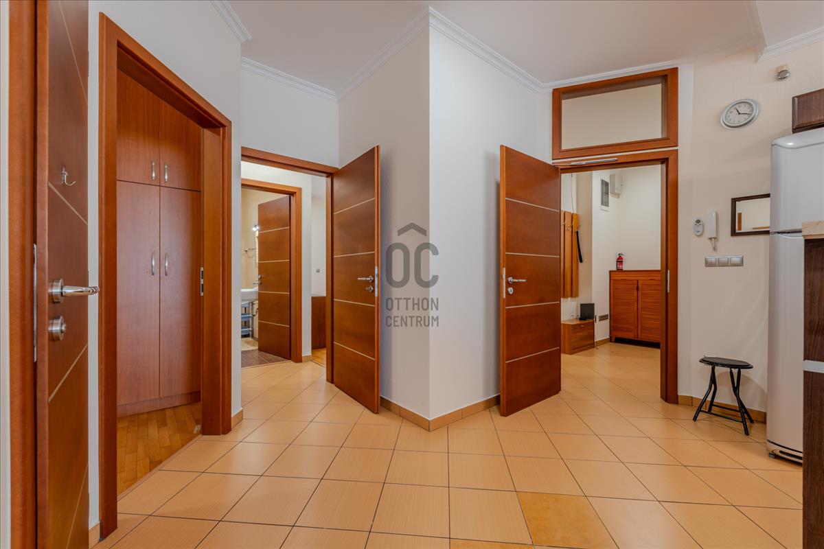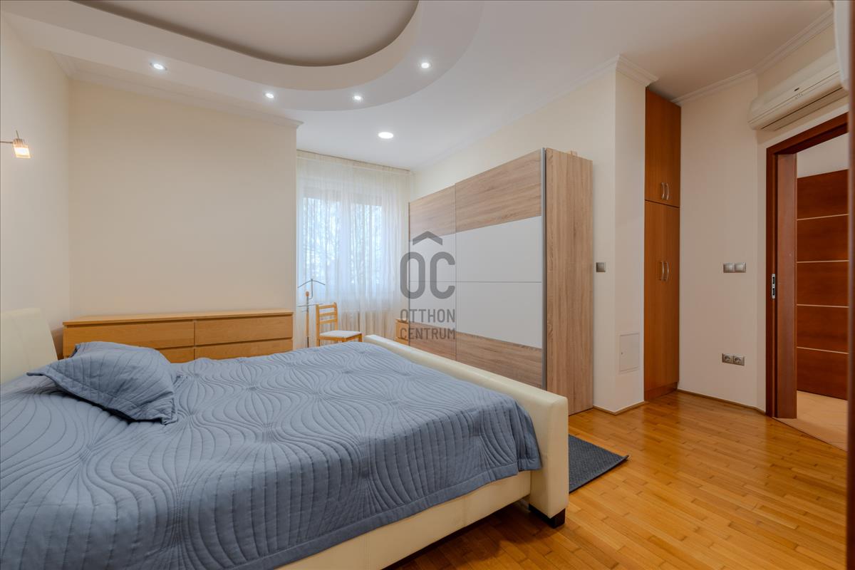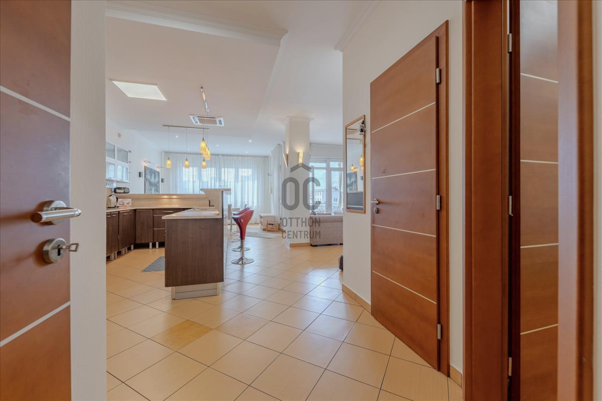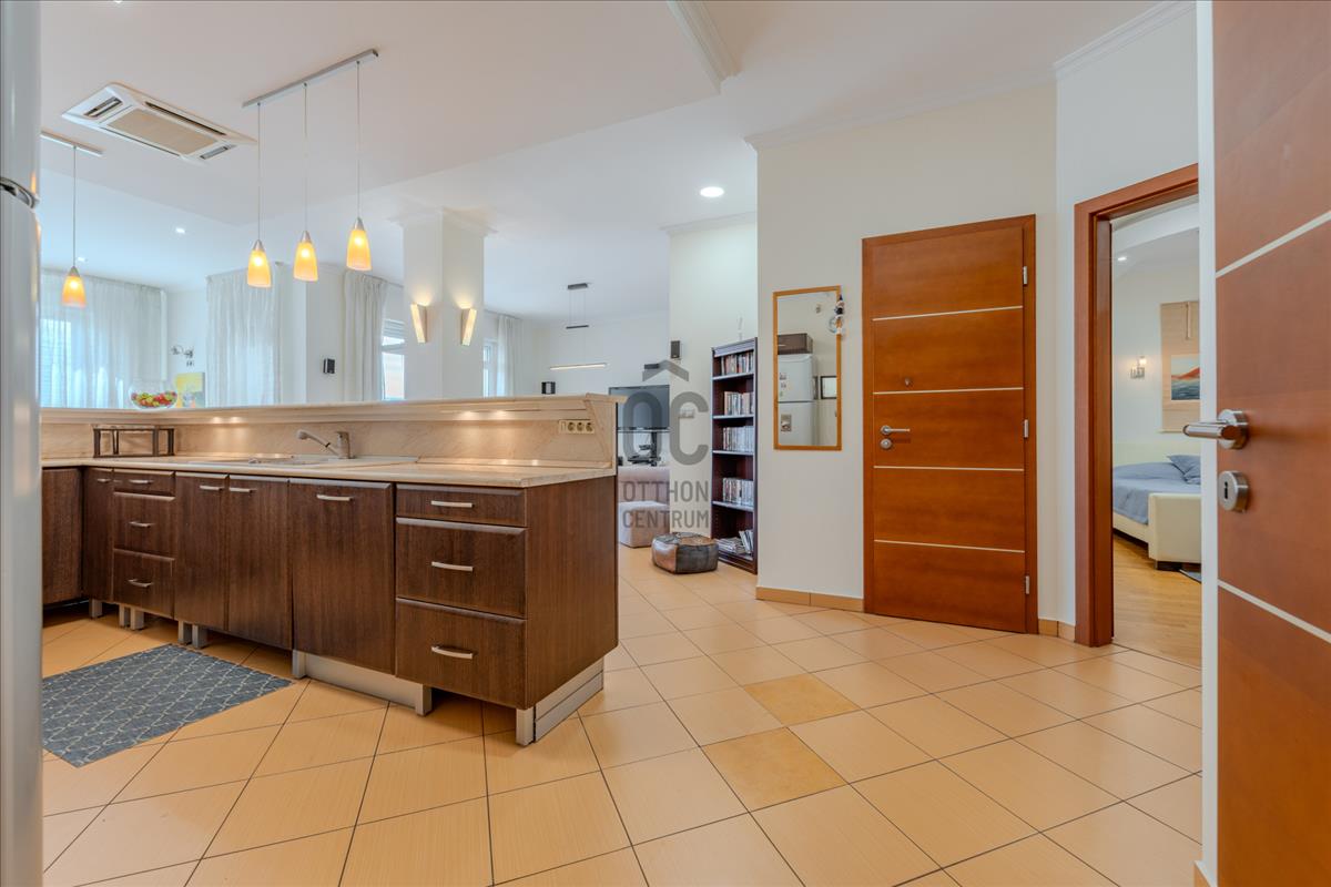 A lakás technikai felszereltsége (motoros redőnyök, beépített szekrények) a maximális kényelmet szolgálja, a biztonságról pedig kiépített riasztórendszer gondoskodik.