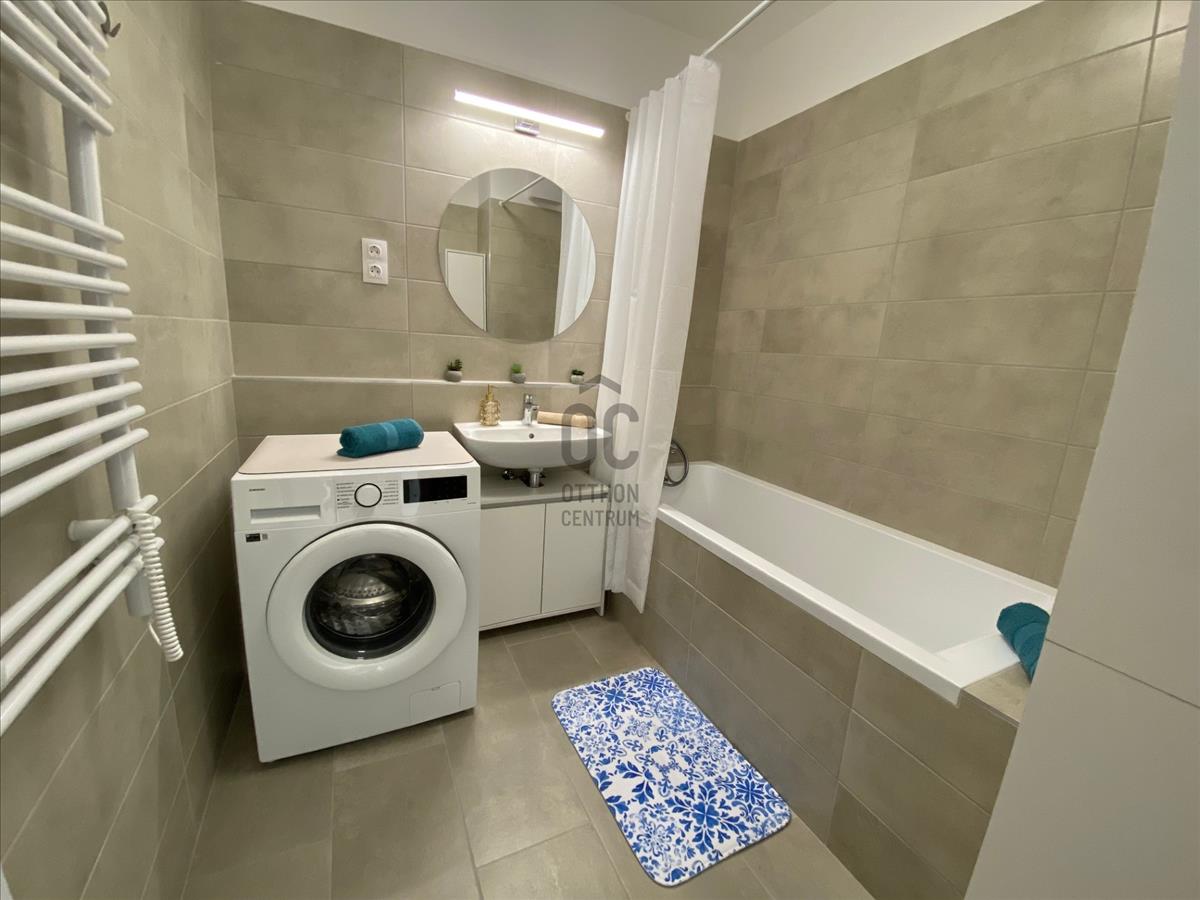 A fürdőszoba modern burkolatokkal és kialakítással készült, a wc külön helyiségben található, tovább növelve a lakás praktikumát.