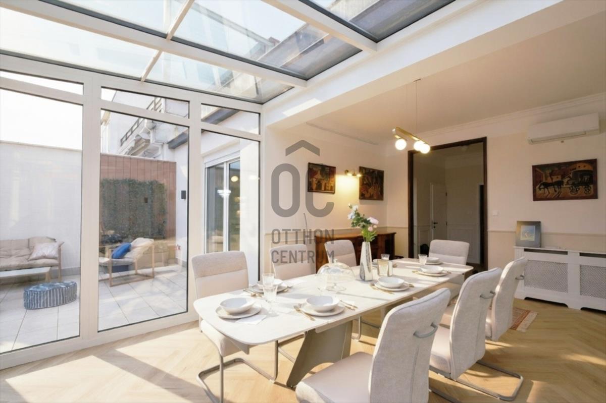 Penthouse a Szent István park felett – Margitsziget-panoráma, 50 m²-es tetőterasz, luxus Újlipótváros szívébenA 110 m²-es, belsőépítész által megálmodott otthon a kifinomult dizájn és a mindennapi kényelem kiegyensúlyozott elegyét kínálja. a lakás szíve az üvegfalú télikert-étkező, ahol télen-nyáron természetes fényben élvezheti a Dunára és a budai hegyekre nyíló kilátást.