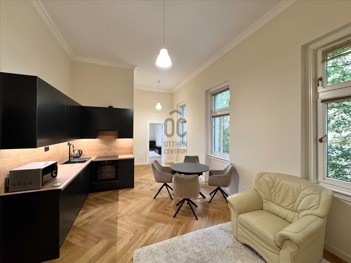 LAKÁS: 69 nm, teljesen felújított, bútorozott és gépesített (hűtő, mikró, mosó- és szárítógép), 2 és fél szobás, nagyon csendes, saját cirkófűtés padlófűtéssel, gyönyörű vadonat új valódi fa parkettával, teljes értékű konyhával a nappaliban, vadonat új 3 rétegű fa ablakokkal.