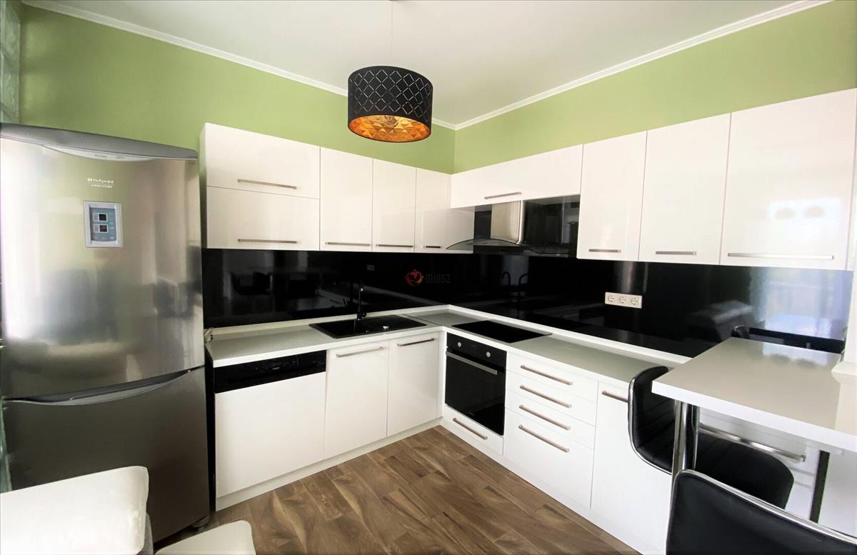 A konyhában magas fényű fehér konyhabútor található, gépesítve, nagyméretű hűtőszekrénnyel, beépített kerámia főzőlappal, beépített elektromos sütővel, mikrohullámú sütővel.